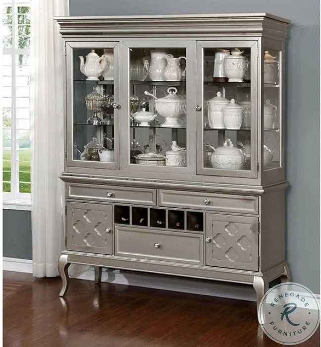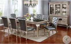 This dining collection will be the focal point of any home with its eye-catching silver/gray finish and elegant structure. Double glass inserts draw attention to the Moroccan-inspired inset patterns while a convenient 18-inch leaf offers the option of hosting a large or intimate dinner. This dining collection is the perfect statement addition to any dining area.