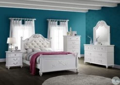 Annie Twin Platform Bed is what little girl dreams are made of. The twin bed offers a sense of wonder, featuring delicate bow moldings throughout, a button-tufted, white faux leather headboard, and sparkling crystal-ball posts.