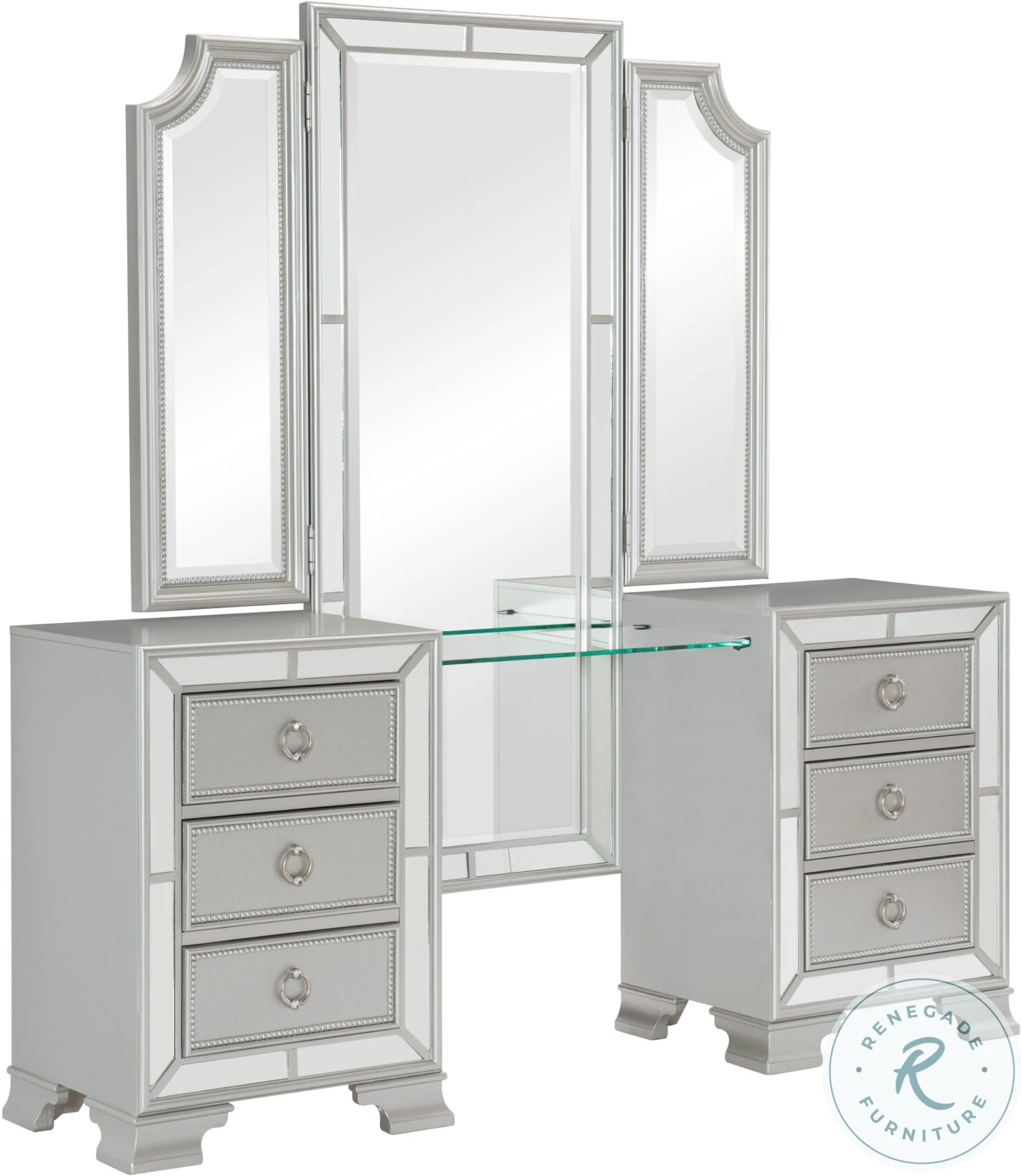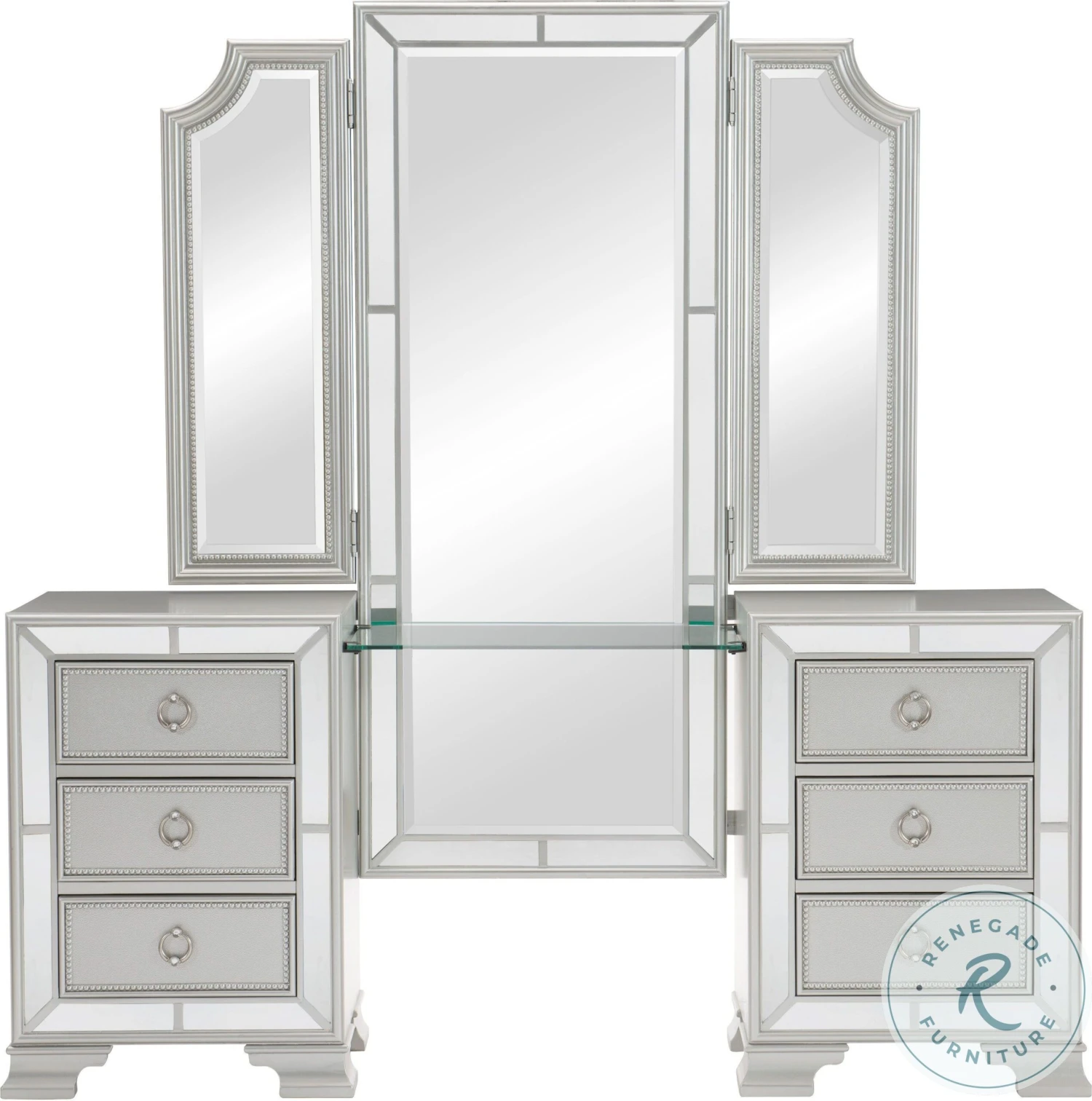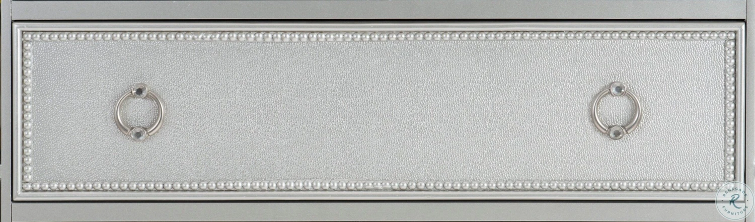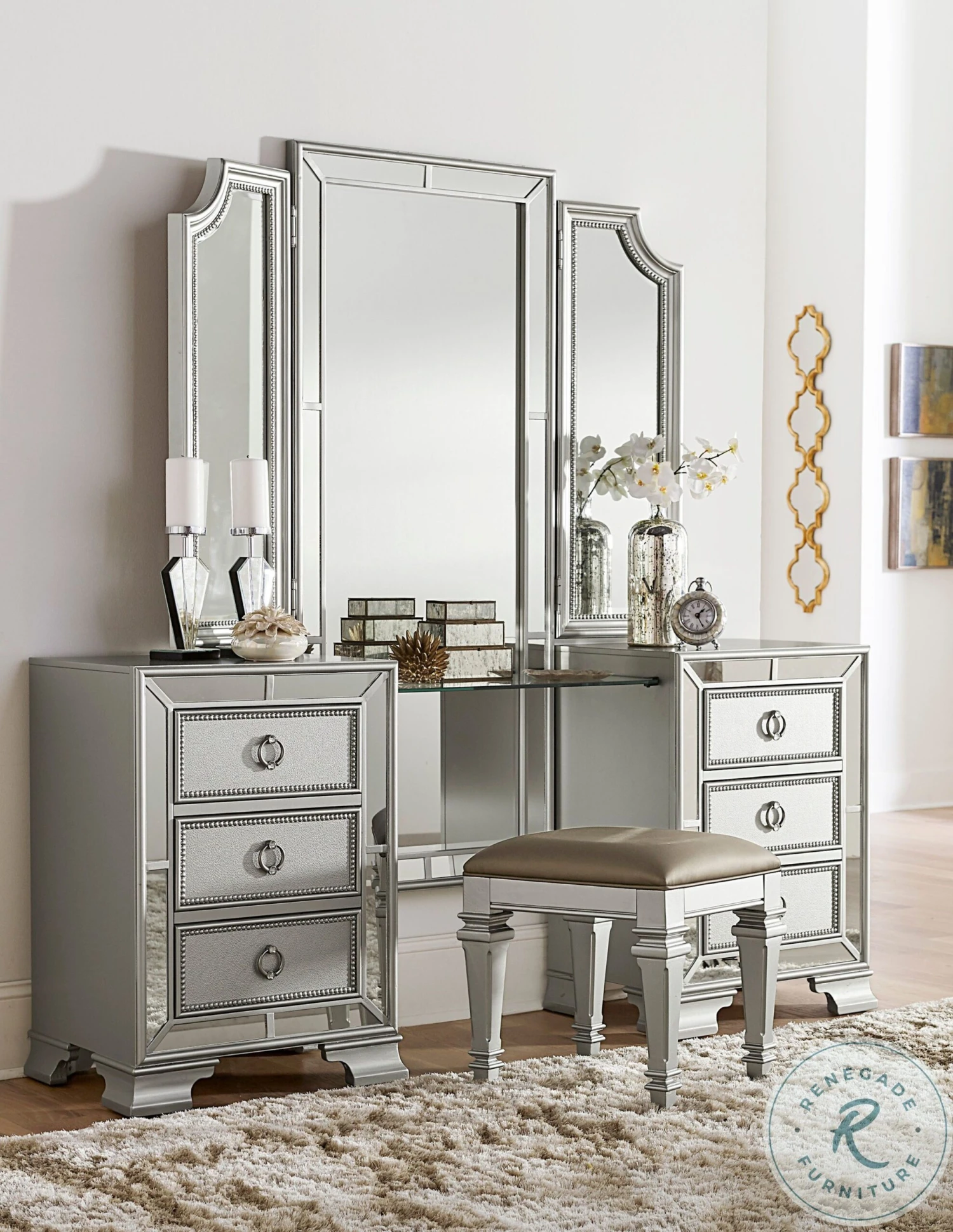 The reflection of your glamorous image is one of striking style and classic sophistication, all illuminated by the boldly designed Avondale Collection. Mirrored framing immediately draws your eye to the modern-traditional profile of the case goods and bed as do the clipped corners on the bed mirror and vanity. Silver finished drop pull hardware centers each bead-molding adorned drawer front. The silver finish of the collection is illuminated not only by the reflected light off the mirrors, but it is also enhanced by the contrasting silver-gray crystal button-tufted accents on the headboard and footboard. Beyond the traditional case goods that are offered, an available vanity further enhances your space. Glass is mounted between the two vanity drawer units. Jewelry hooks provide convenient storage behind the folding mirrors and the available coordinating stool complements the collection.