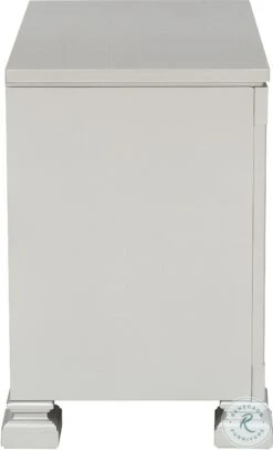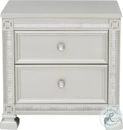 Modern glamour is exemplified in the design of the Bevelle Collection. Acrylic crystals frame each piece in the collection, reflecting the light to create eye-catching drama. The silver finish serves as the perfect complement to the high-polish decorative knob hardware and medallion accents. A stylish mirrored vanity, with coordinating stool, provides additional function to the collection. Providing contrast to finish is the dark gray bi-cast vinyl, button-tufted headboard panel. A coordinating dining room is also available.