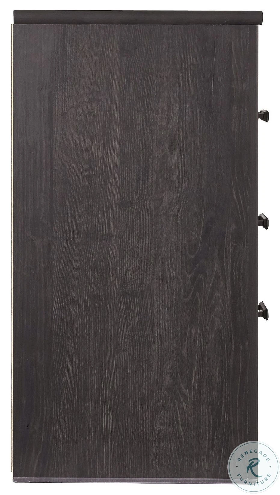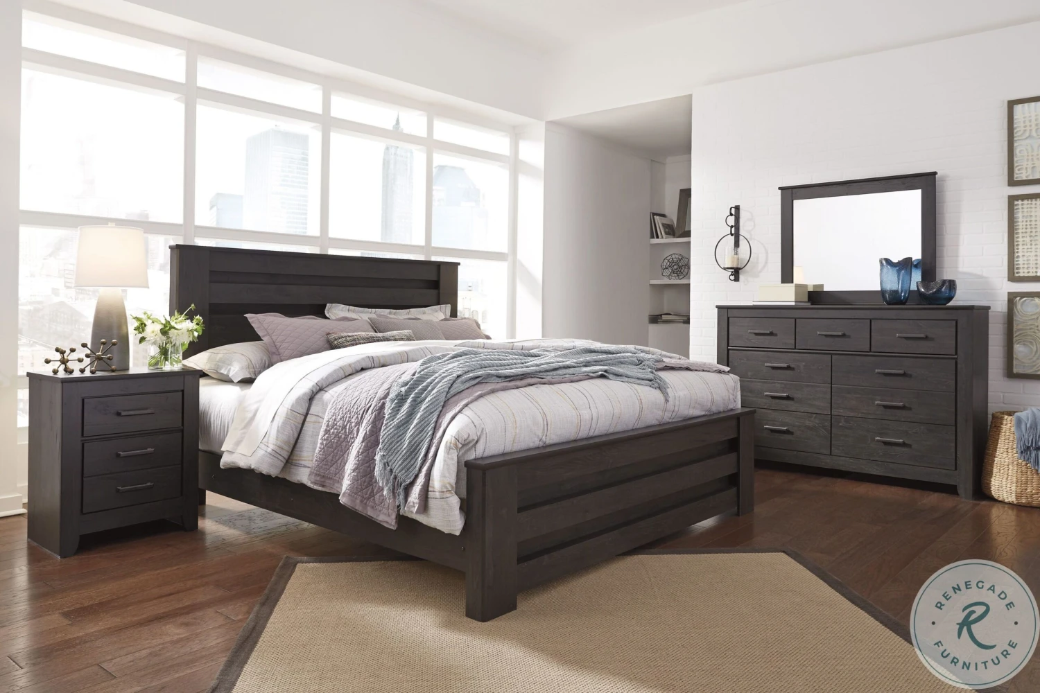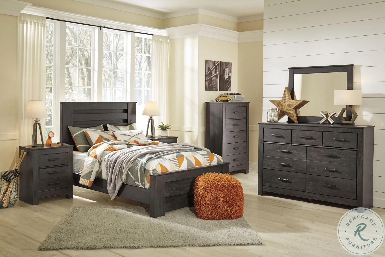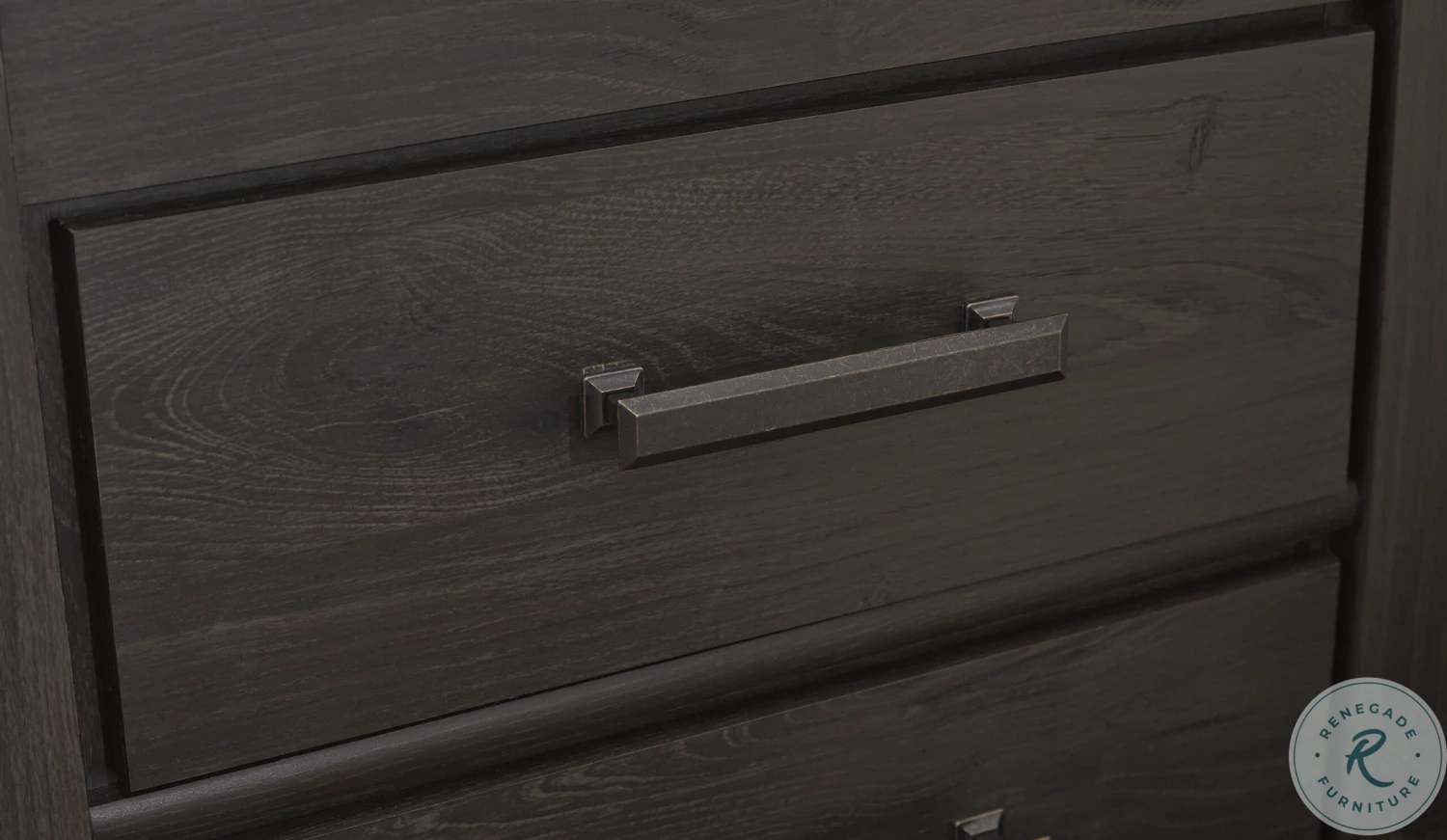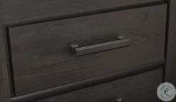 Priced to entice and styled to impress, this Brinxton Collection makes the most of a clean lined, contemporary profile. With sizes scaled to meet your needs, the design merges cool form and practical function. Replicated oak grain effect gives the modern, charcoal gray finish warmth and character. Linear pulls are a sleek touch.