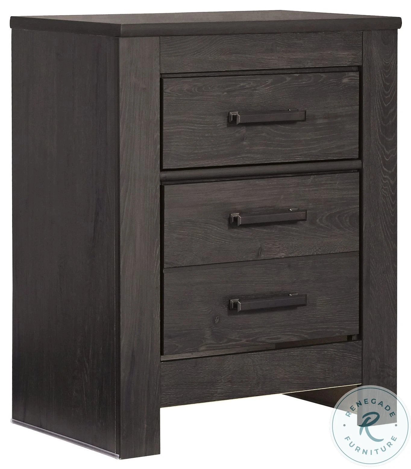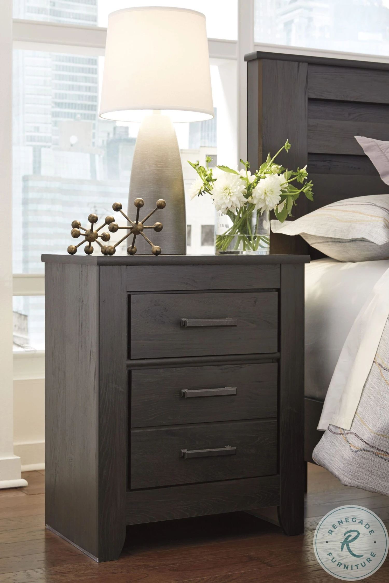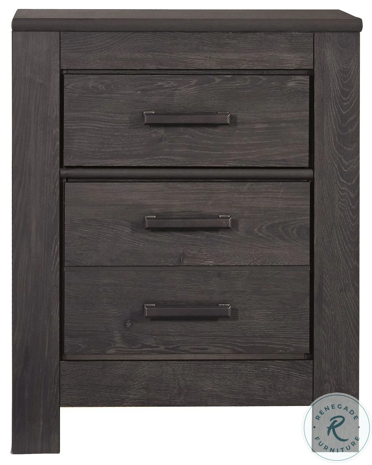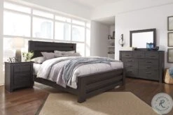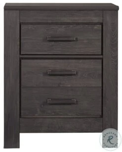 Priced to entice and styled to impress, this Brinxton Collection makes the most of a clean lined, contemporary profile. With sizes scaled to meet your needs, the design merges cool form and practical function. Replicated oak grain effect gives the modern, charcoal gray finish warmth and character. Linear pulls are a sleek touch.