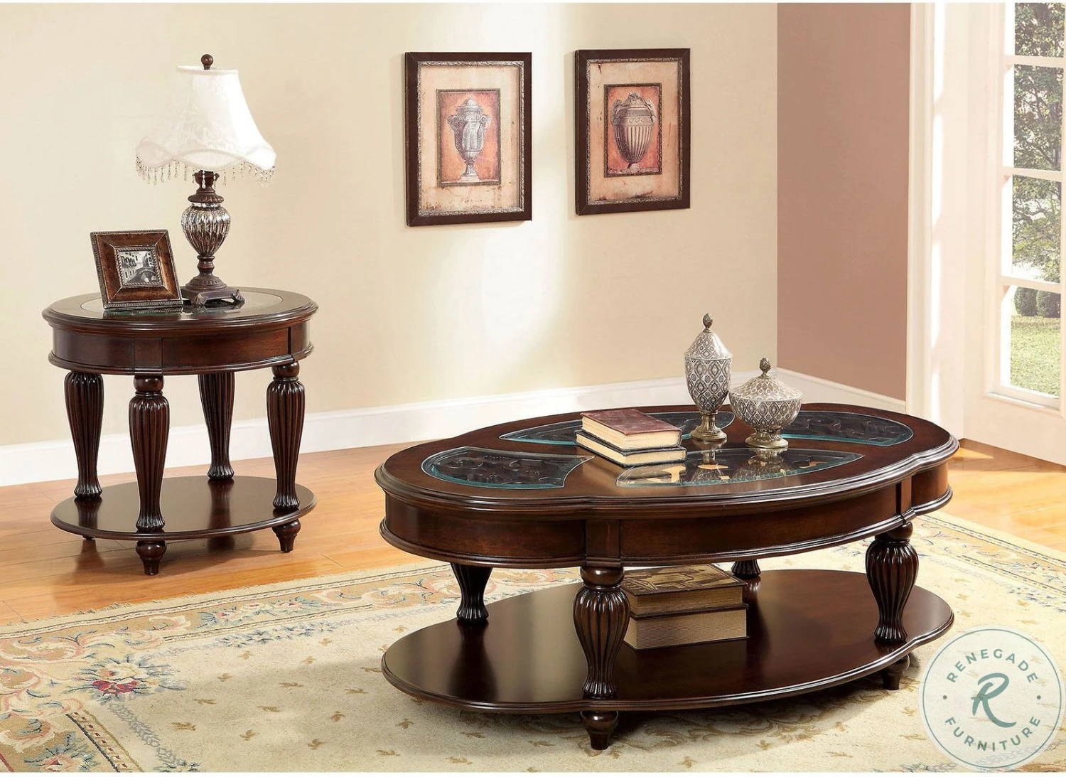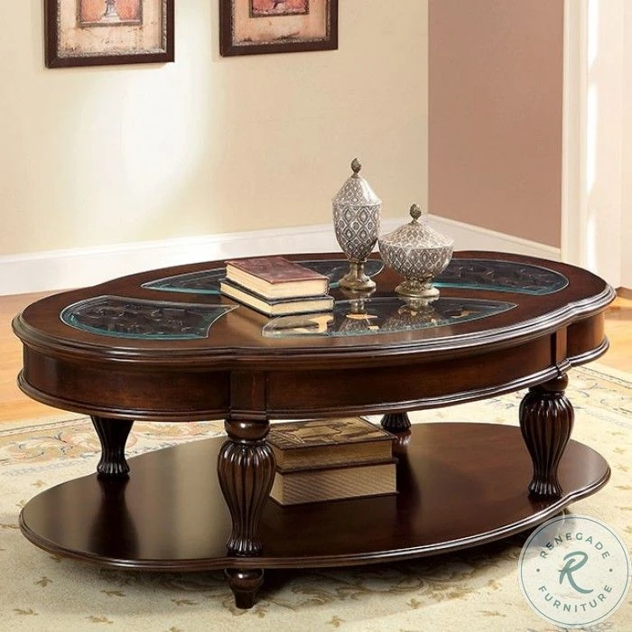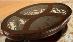 For a more traditional home, this beautiful set has beveled glass inserts on top, intricate designs, gold brush accents, and lion claw feet. The antique oak finish tops this elegant look.