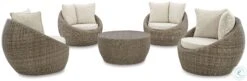 This Danson Collection completes your outdoor seating area with its fresh take on casual comfort. Handwoven resin wicker over a curving aluminum frame balances streamlined style and exceptional durability. High performance beige Nuvella PLUS fabric wraps the seat and back cushions, protecting against the natural elements.