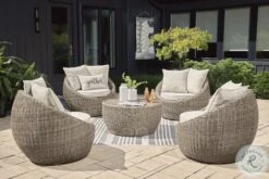 This Danson Collection completes your outdoor seating area with its fresh take on casual comfort. Handwoven resin wicker over a curving aluminum frame balances streamlined style and exceptional durability. High performance beige Nuvella PLUS fabric wraps the seat and back cushions, protecting against the natural elements.