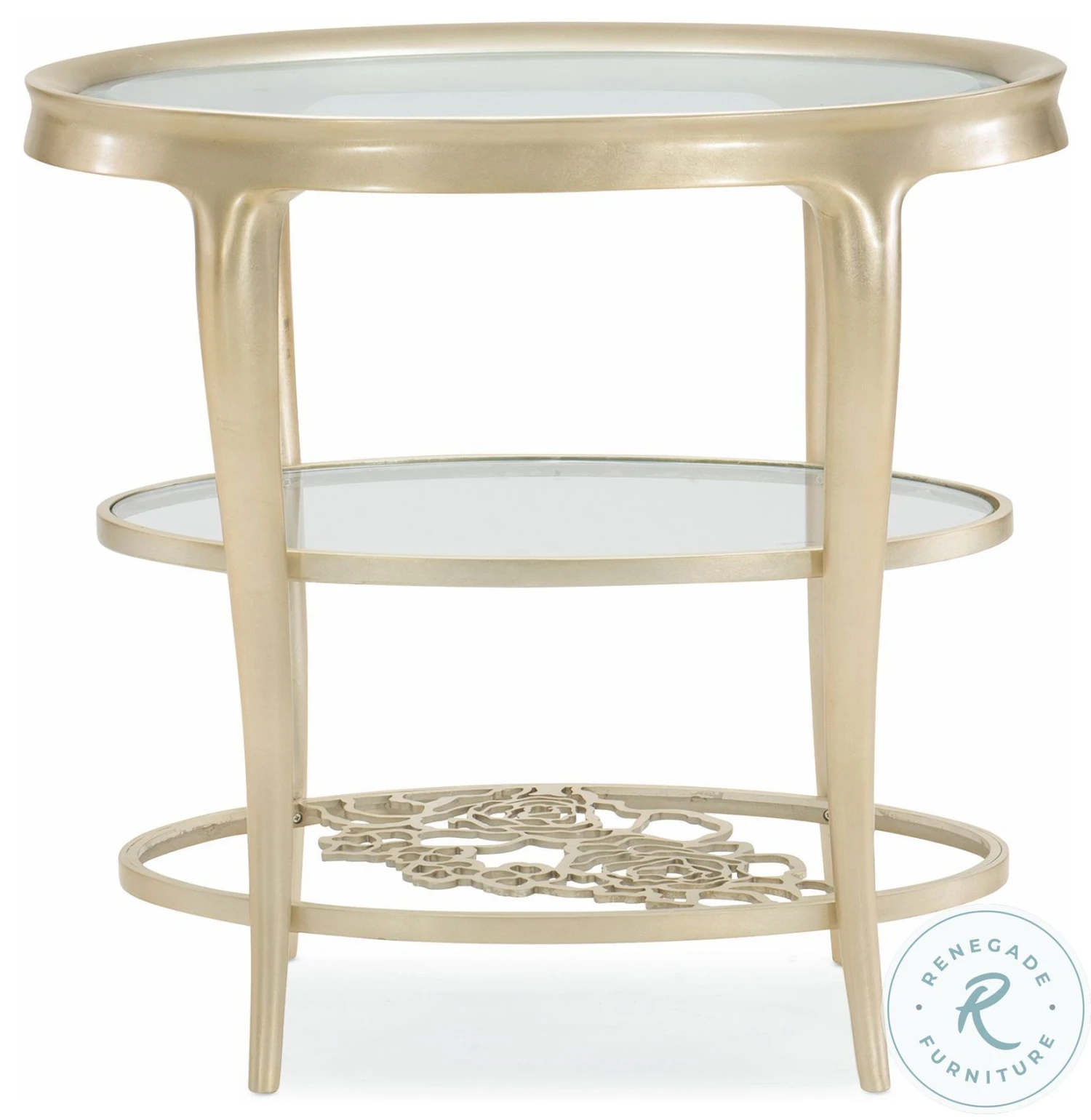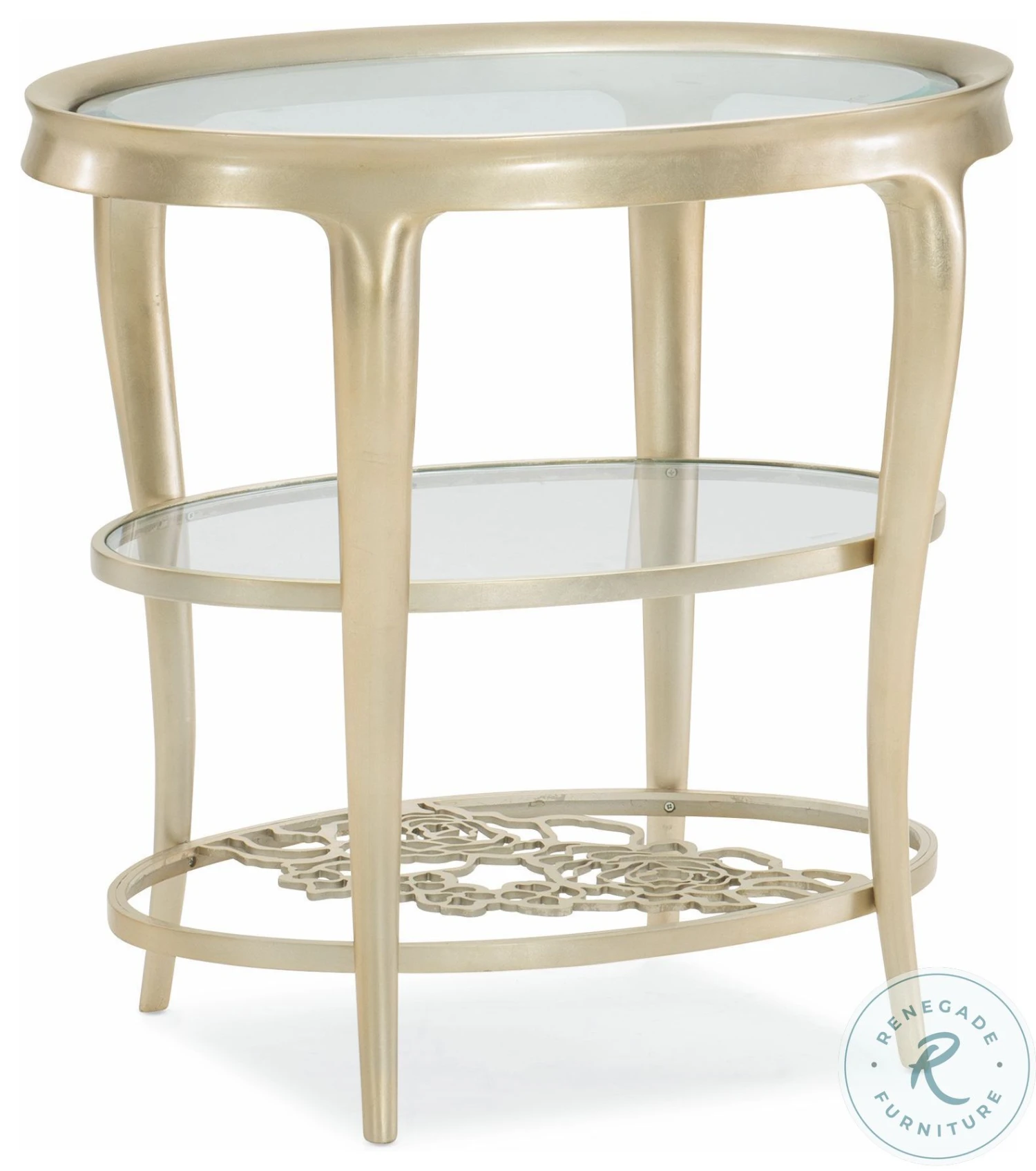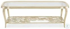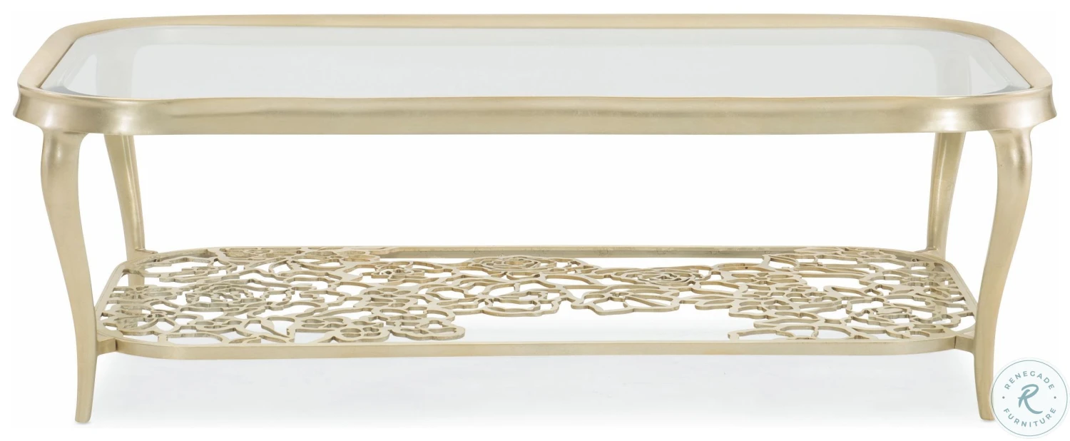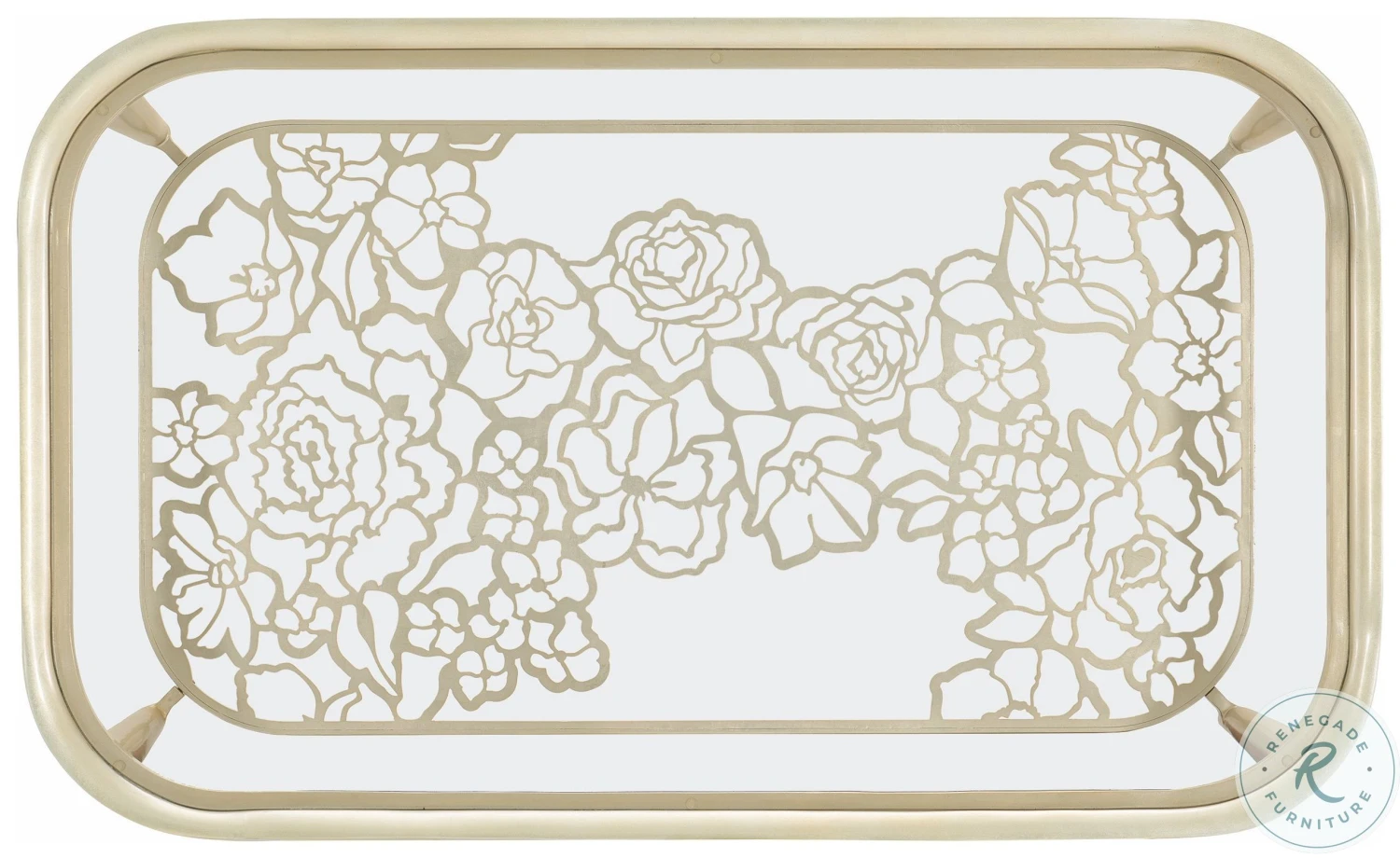 Defined by it’s distinctiveness this cocktail table is in full bloom. A rounded rectangular metal frame encloses a tempered-glass top with elegant bevel. Look below and see the beauty of a metal stretcher crafted of cut out flowers arranged in a geometric pattern forming a virtual garden. Graceful cabriole legs support it’s open design and are highlighted with a silver leaf finish in Oracle. While traditional at heart this captivating table is sure to surprise and delight all who see it.