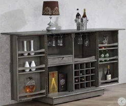 Today’s hottest gray finish with flip over tops, castors, wine rack, pull out drawer, stemware holder and take away tray.