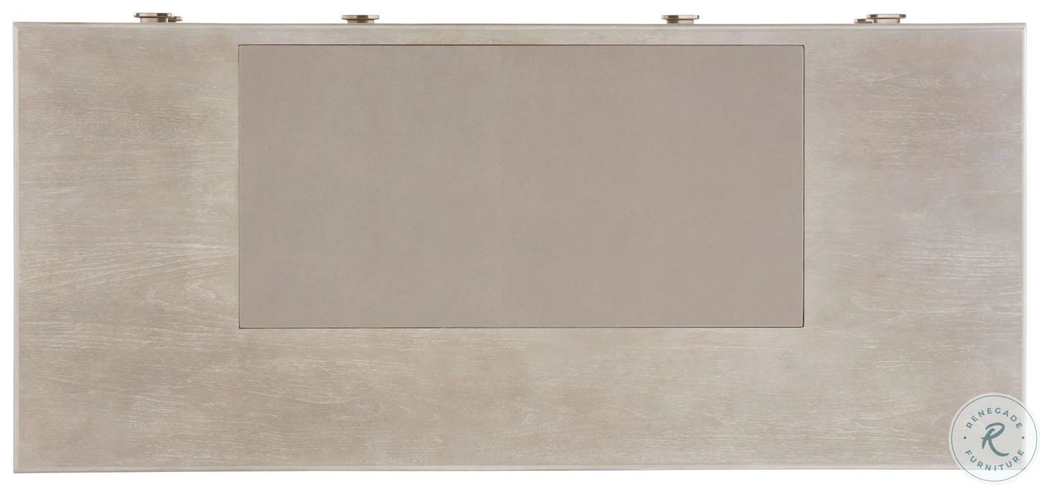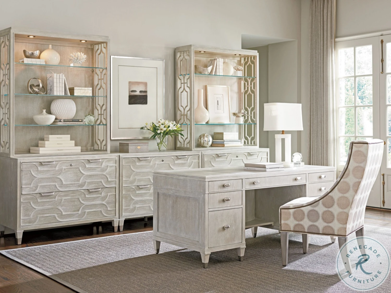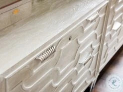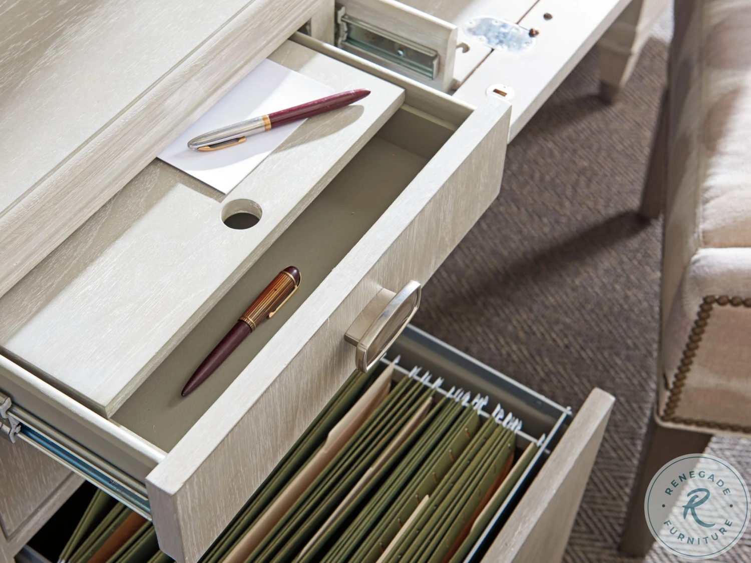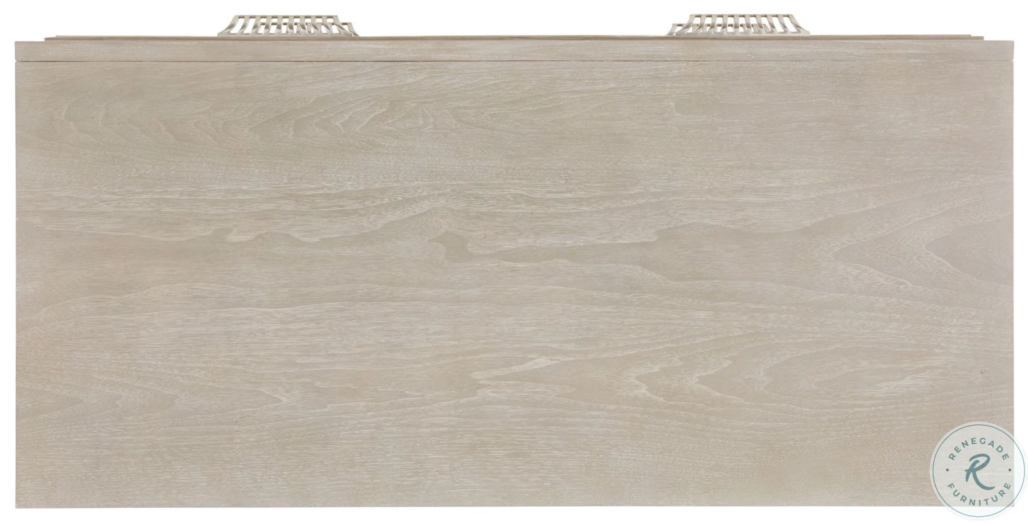 Crafted from select walnut veneers, Greystone designs reflect a sophisticated tone. Its surfaces are wire brushed by hand to accentuate grain characteristics and then finished in a soft pearl gray coloration with a white glaze that adds visual interest. The collection signature design elements are the contemporary fretwork pattern showcased on the file chest, deck and media console, and custom hardware in a striking brushed nickel finish. The look is remarkable, offering a fresh contemporary aesthetic to one of the most important rooms in the home.
