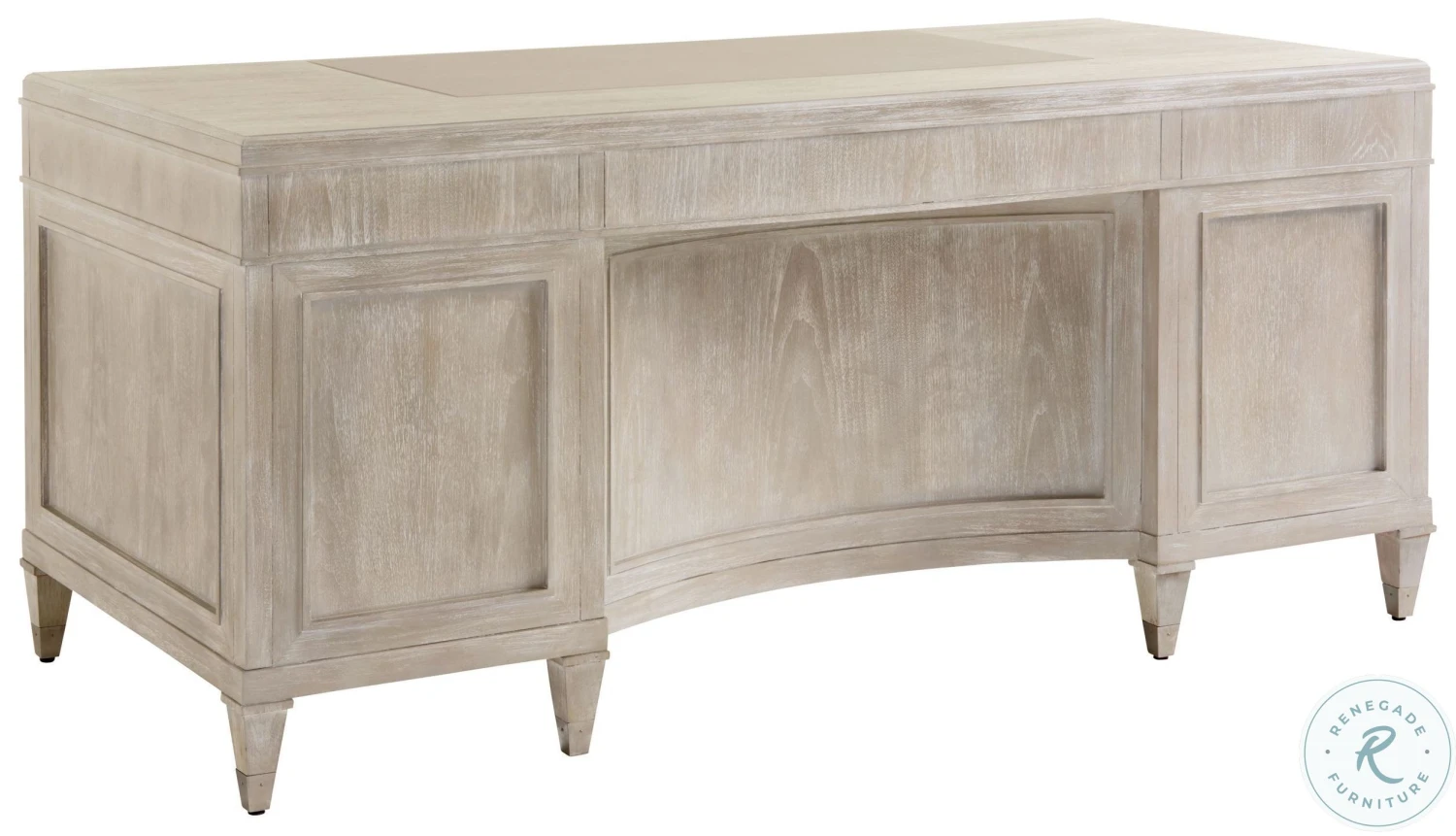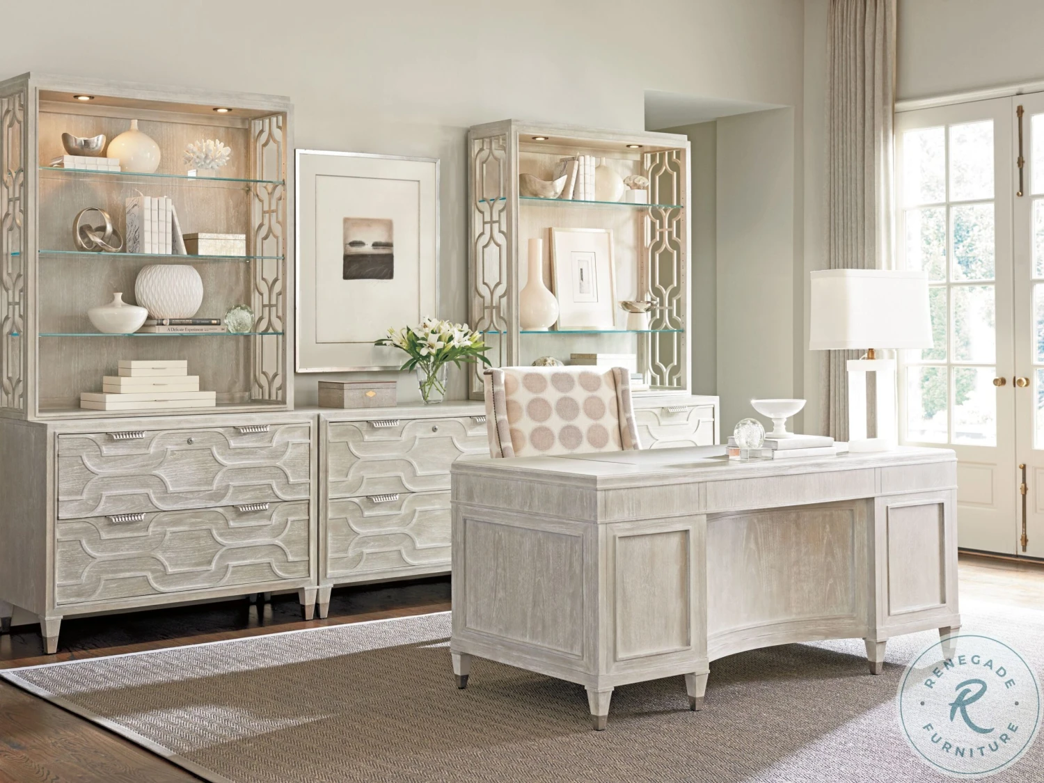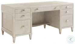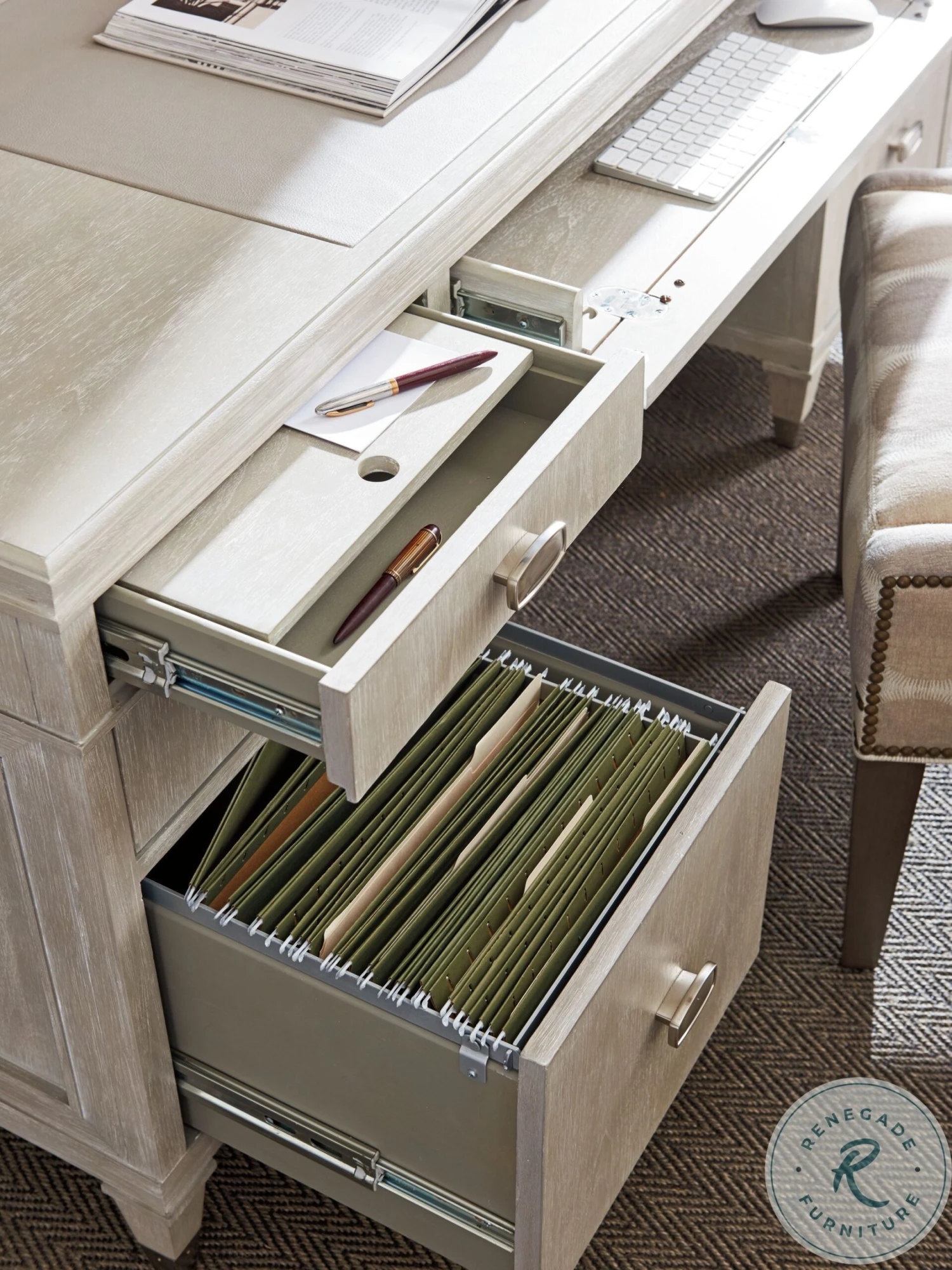 Crafted from select walnut veneers, Greystone designs reflect a sophisticated tone. Its surfaces are wire brushed by hand to accentuate grain characteristics and then finished in a soft pearl gray coloration with a white glaze that adds visual interest. The collection signature design elements are the contemporary fretwork pattern showcased on the file chest, deck and media console, and custom hardware in a striking brushed nickel finish. The look is remarkable, offering a fresh contemporary aesthetic to one of the most important rooms in the home.