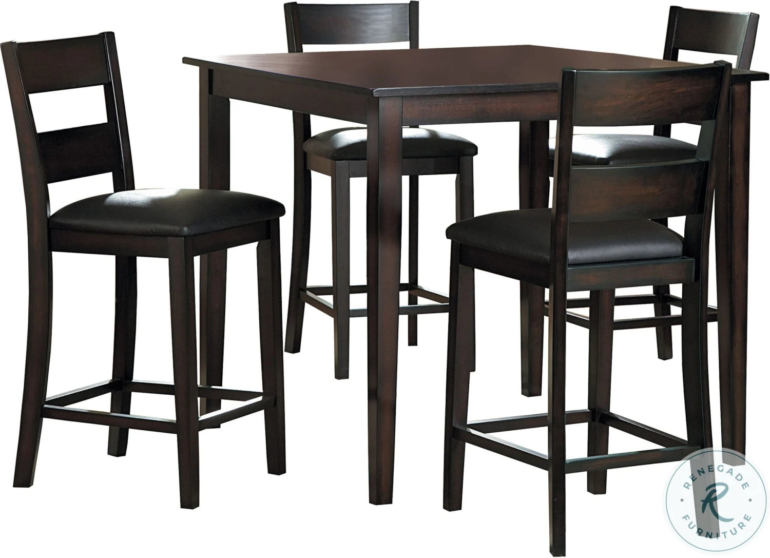 The transitional design of the five-piece Griffin Counter Height Set allows for versatile placement in a number of casual dining settings. The wide ladder back chairs feature black bi-cast vinyl seating that compliments the heavily burnished finish of this 40-inch fixed-top counter height table.