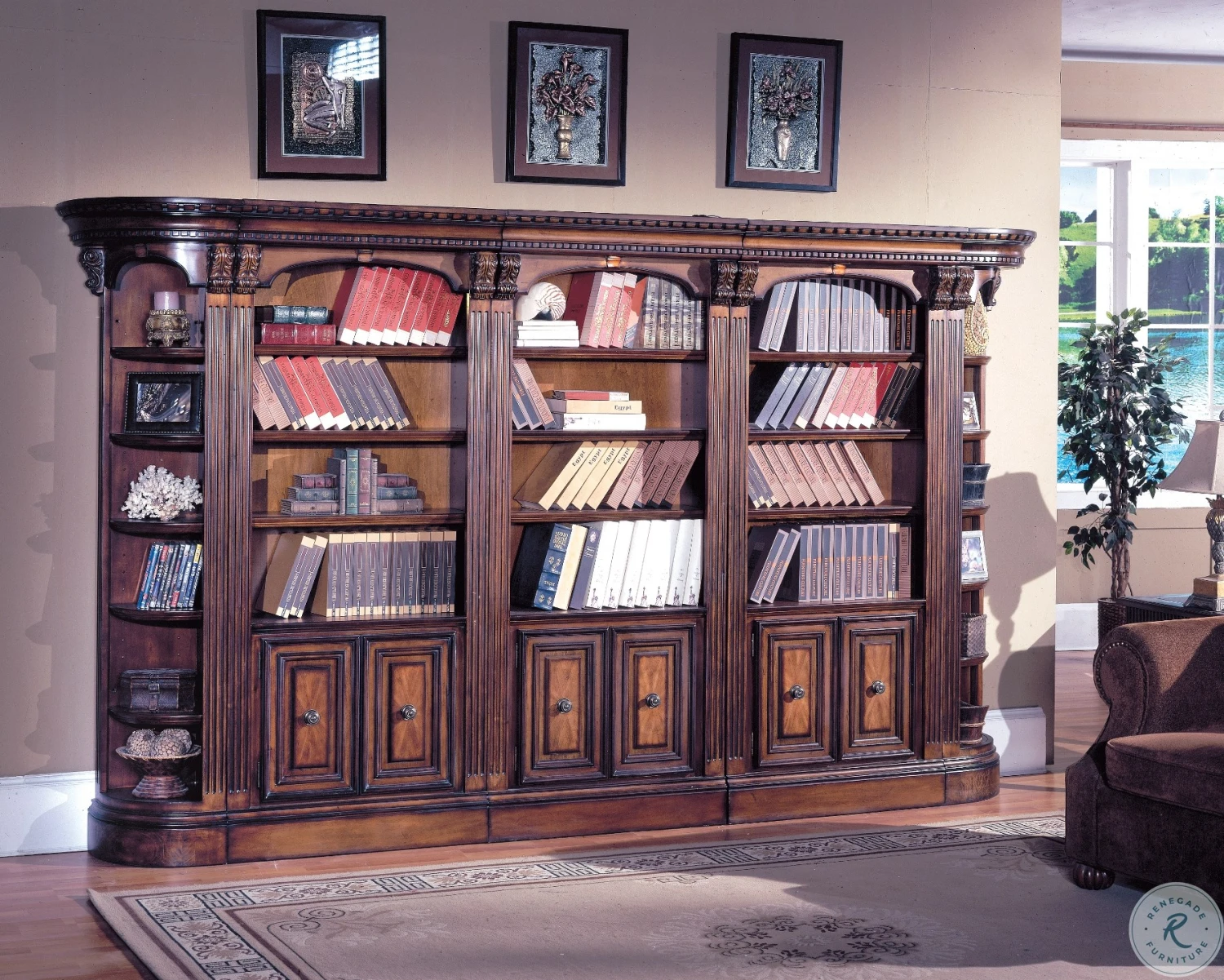 Our Huntington Library Wall bears class and high quality while serving as a modular and multi-functional unit. This collection can be configured as an Entertainment Center, Home Office, Bookcase Wall, and Entertainment Bar Wall. By offering a wide variety of custom storage options, this group is sure to suit your individual and household needs. The Huntington system offers durable wood construction in an Antique Vintage Pecan finish and decorative trims, which adds to its stunning Traditional English style. This group will be sure to infuse your home with an intricate and lustrous feel while providing enhanced functionality.