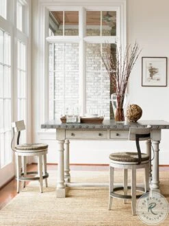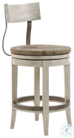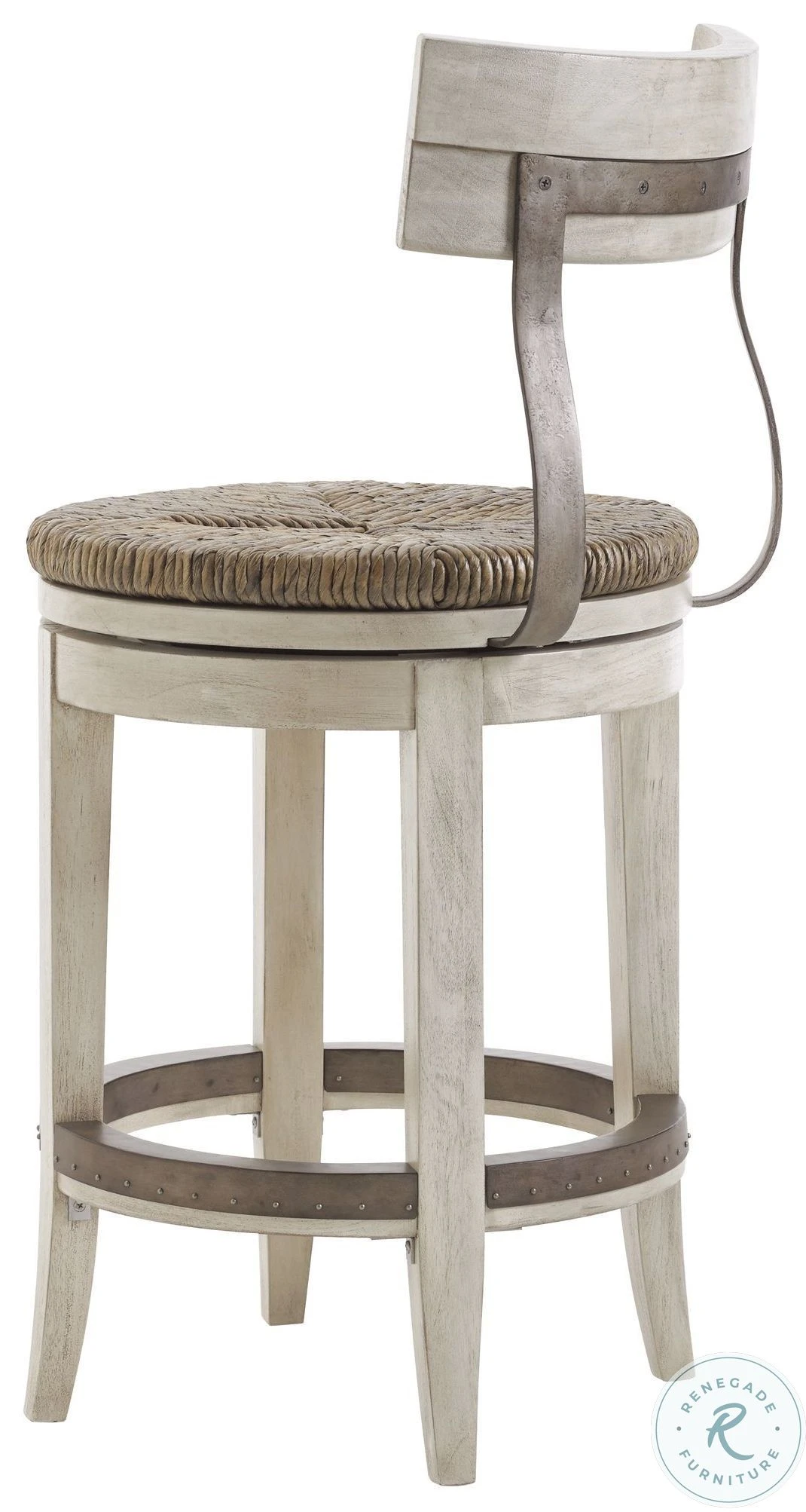 - Chair features ivory finish, casual, yet sophisticated design, hand woven rush seat, swivel mechanism, shaped metal back support and kick plate