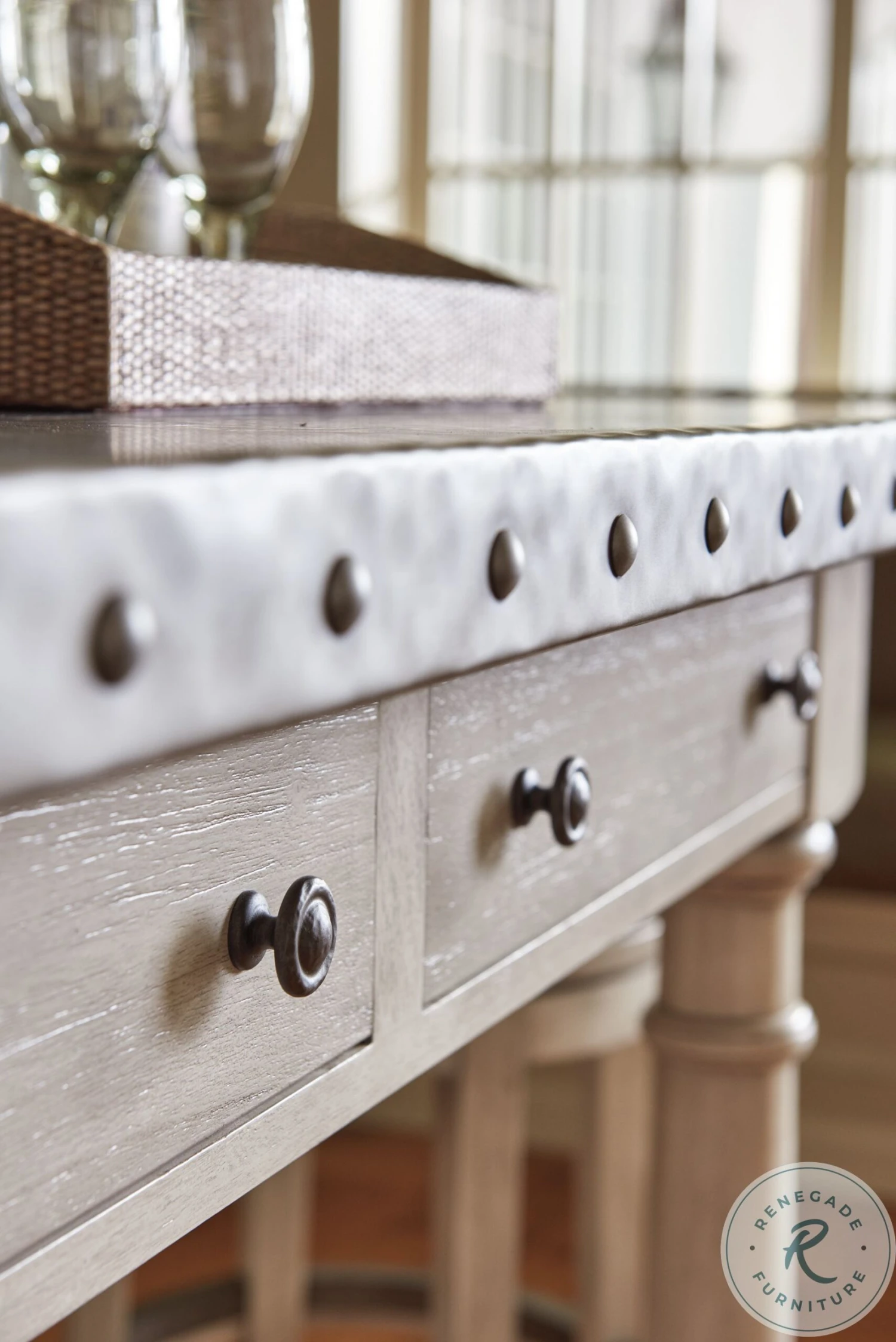 - Decorative nailhead trim on top edge