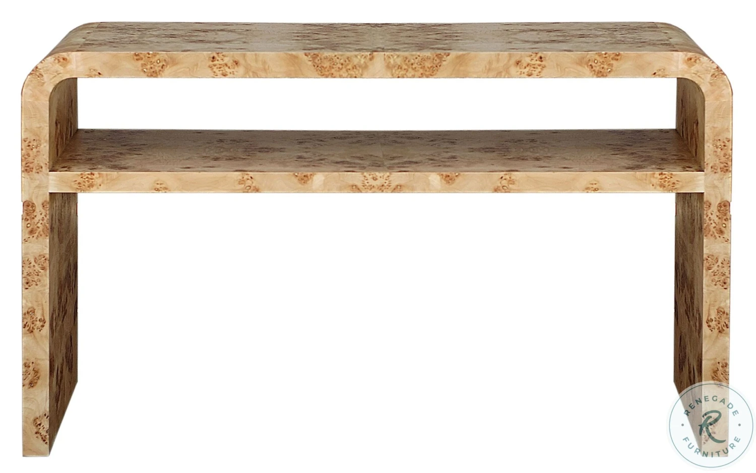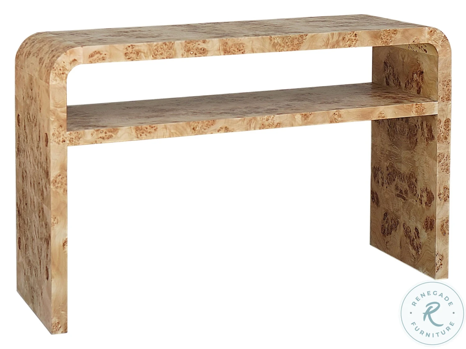 Our mid-century modern, waterfall console table stands out in a crowd. Arcing silhouette and rich, book-matched burl veneer speak to one-of-a-kind, old world craftsmanship. Shelf provides additional stability and storage. As a dramatic centerpiece, Marshall sets the tone for a luxurious, high style living space.