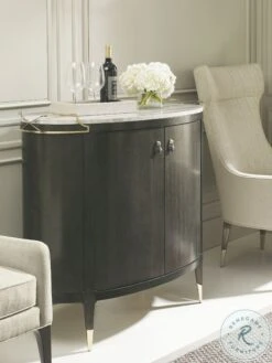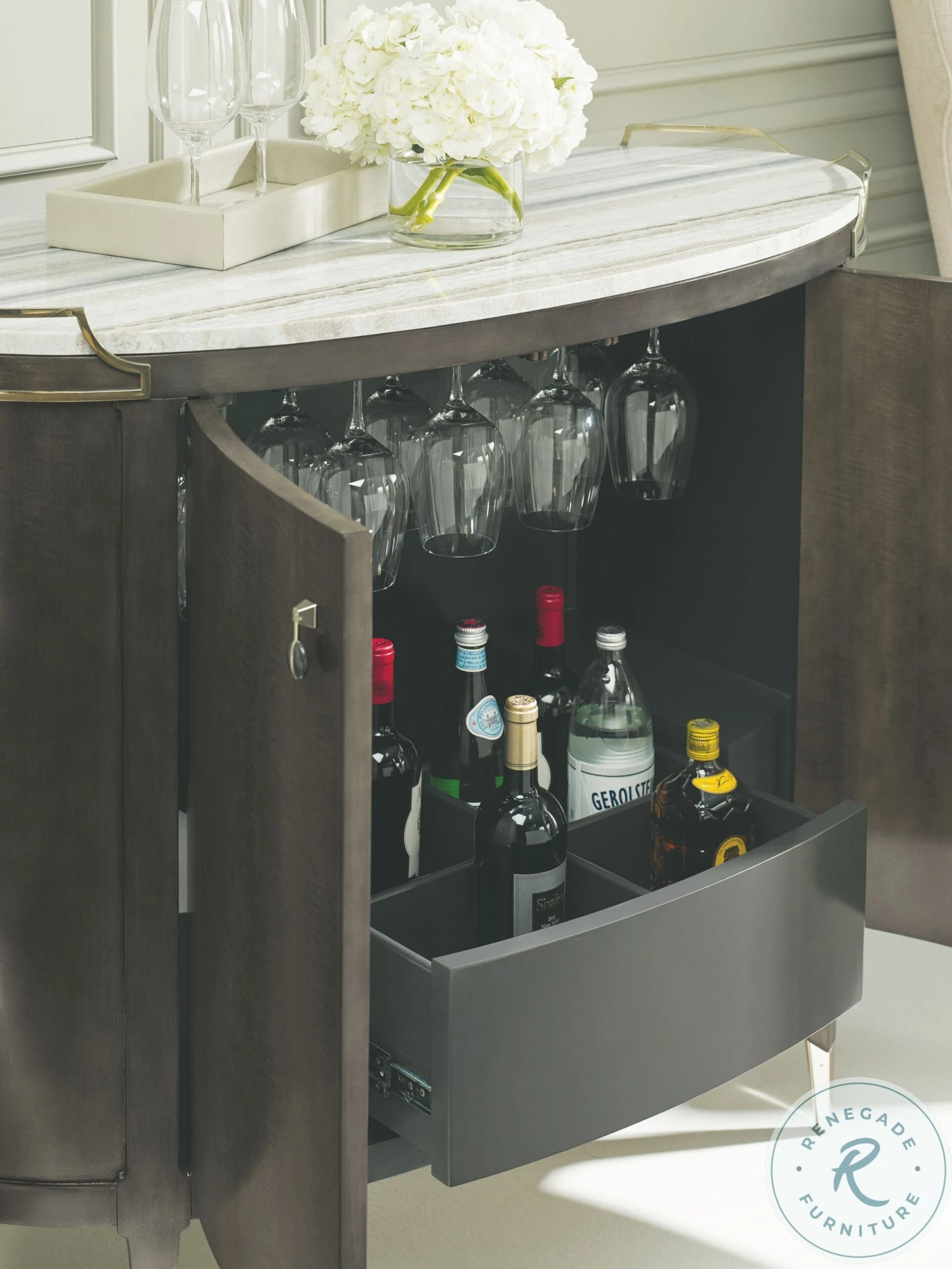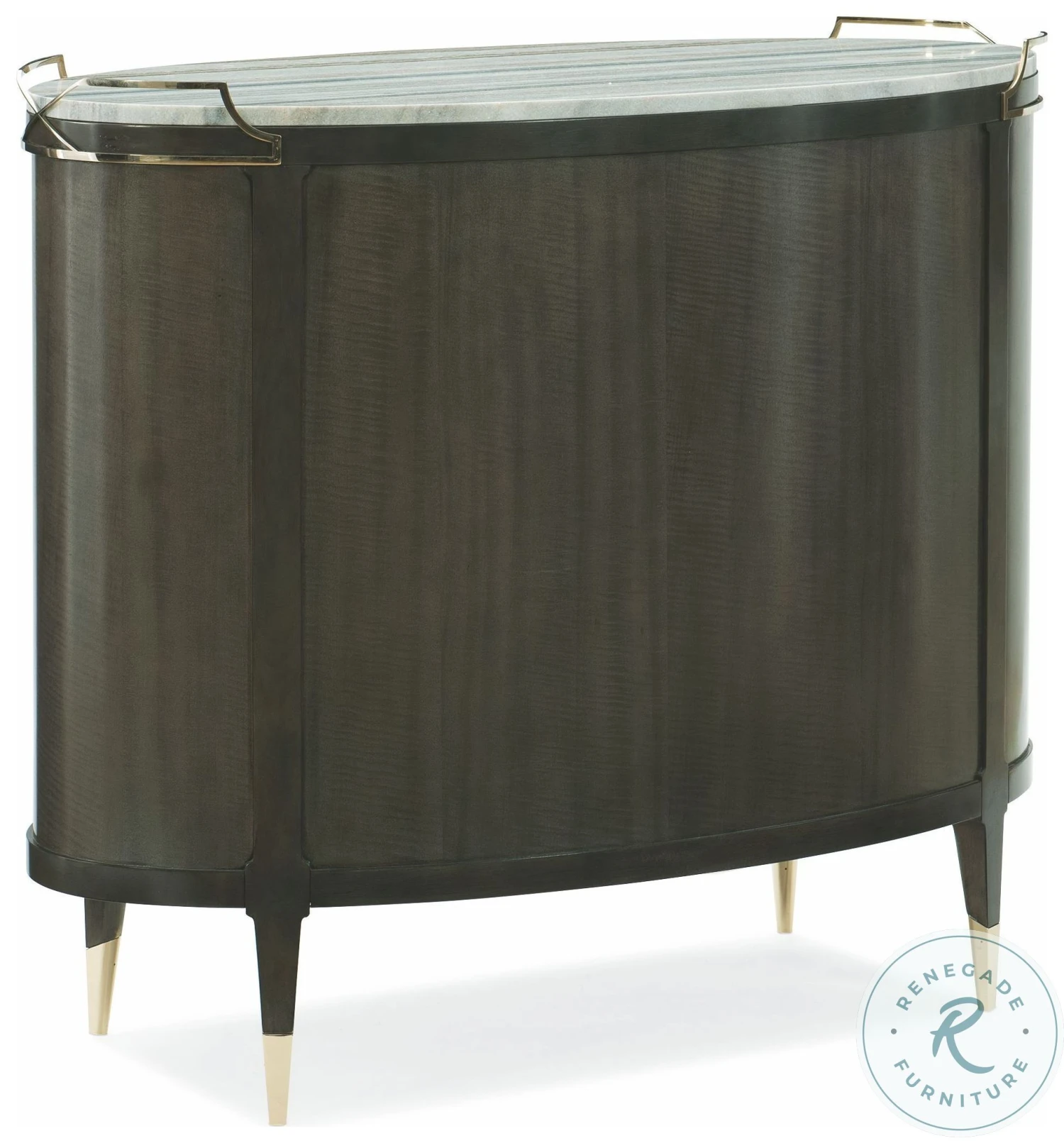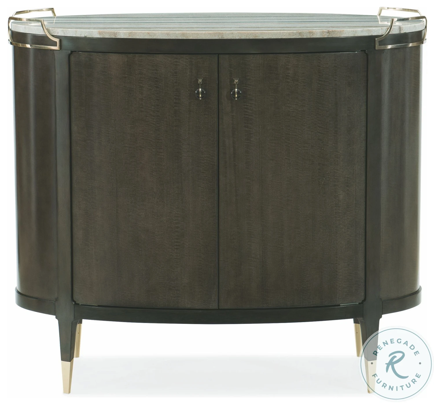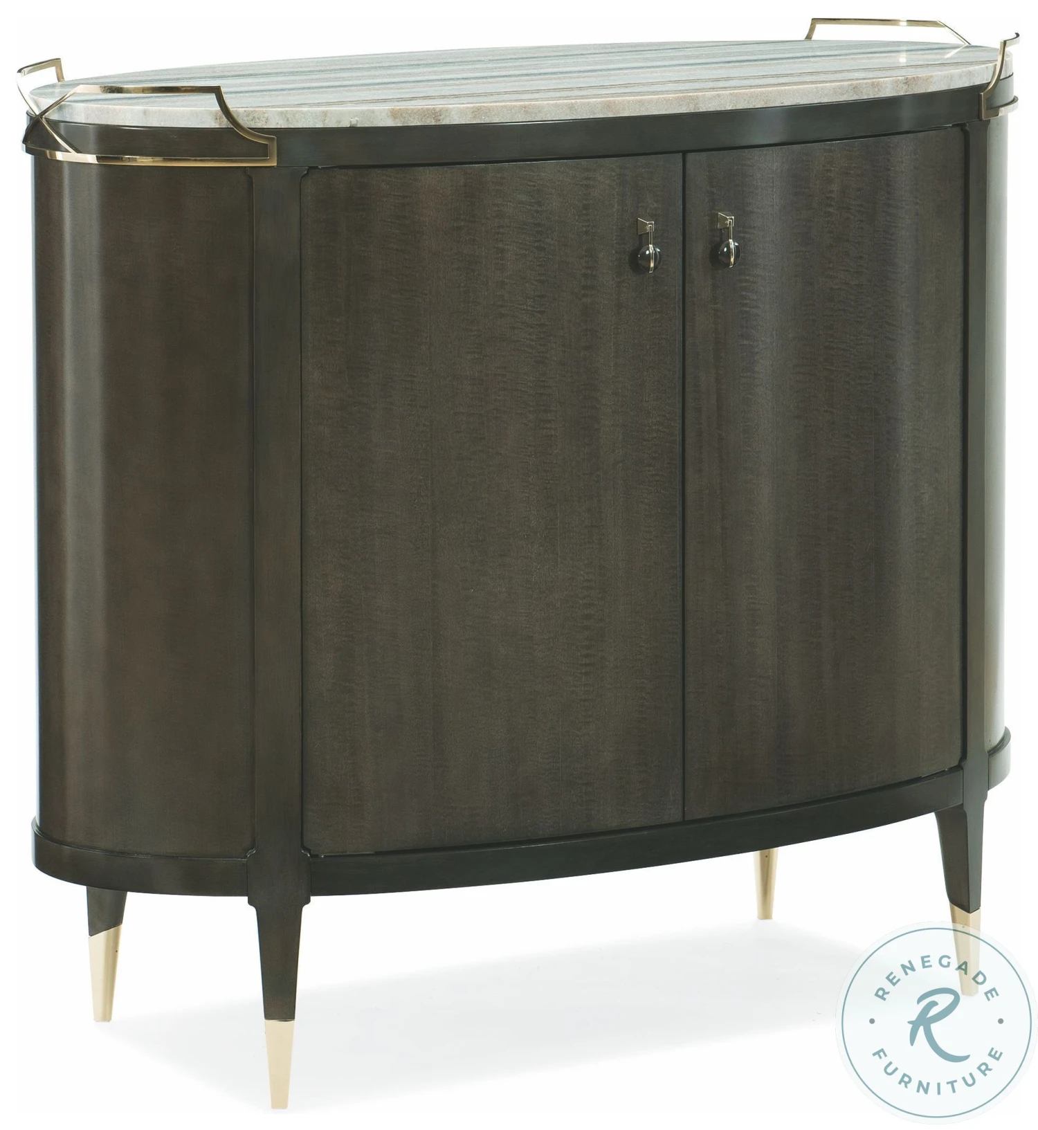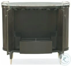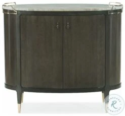 Charcoal anigre comes to life in this oval bar, fittingly titled, Mix-ology. it’s striking blue sandstone top, with brown and grey veins, is trimmed with crisscrossing metal handles in Whisper of Gold that rise above it’s surface. Finished all around the piece, the elegantly curved doors open with custom metal pulls to reveal generous storage for hanging wine glasses, bottles of wine and other bar essentials. This silhouette rests on modern triangular legs fitted in custom metal ferrules. Mix this mid-Century modern piece into classic or modern settings.
