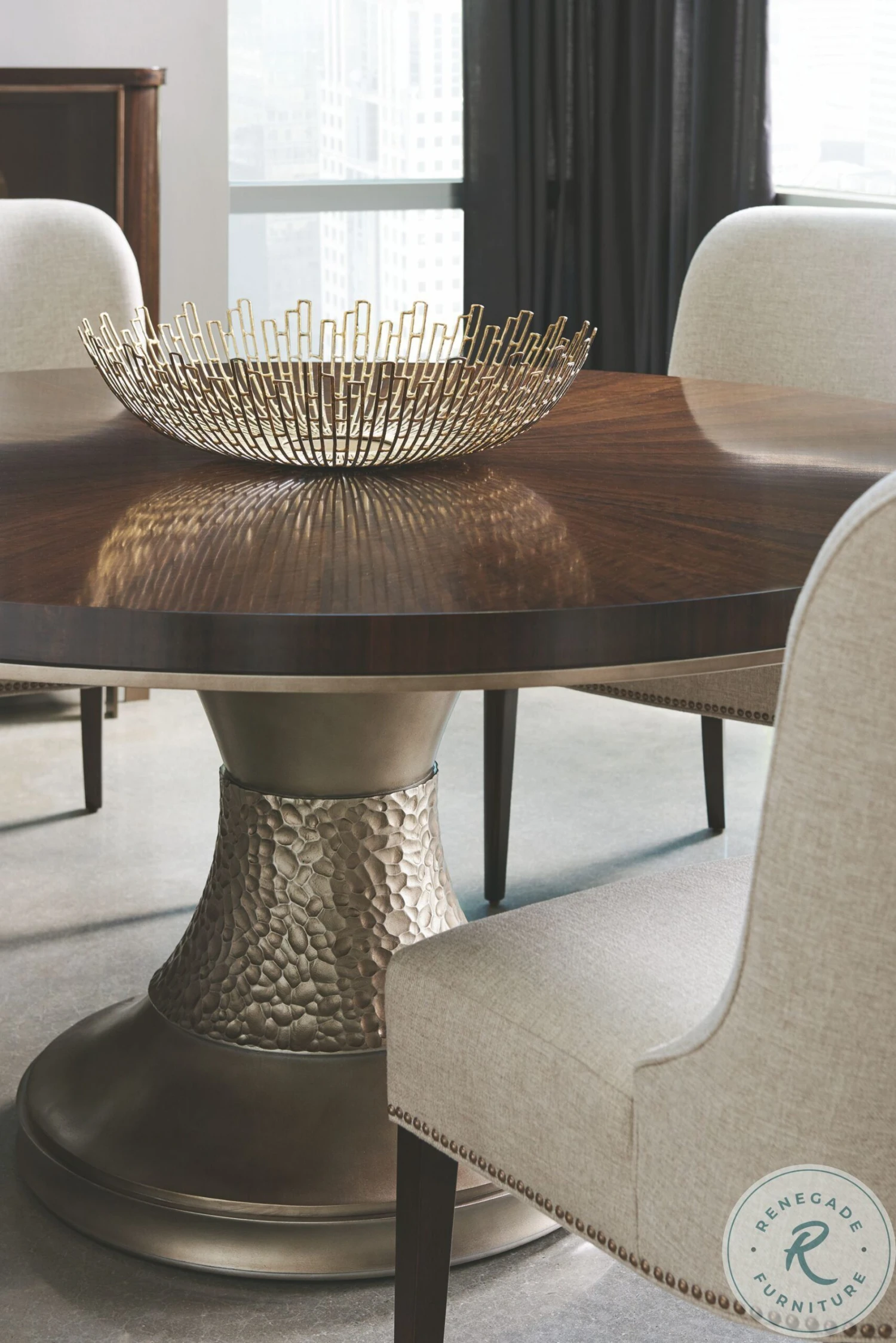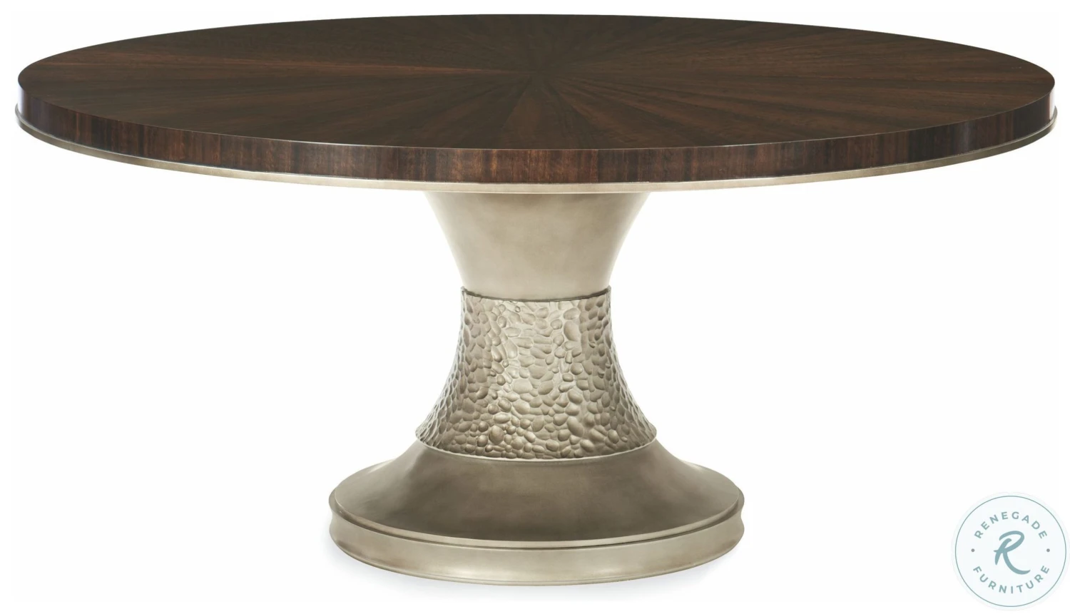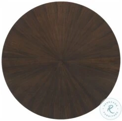 - Table top has a radial matched veneer pattern in aged bourbon