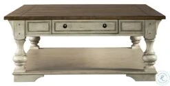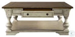 Combine traditional living and todays modern lifestyle effortlessly with the Morgan Creek. Crafted of poplar solids with pine and birch veneers finished in antique white with spatter and watermark accents with a wire brushed tobacco planked top. Features pewter nail head corner accents, round turned legs flowing into a block with tulip feet, three cubbies for additional storage and stool offer padded upholstered seat with swivel base for added comfort. The warm antique finishes and artistic distressing along with grand scale, makes this collection can be passed on for generations.