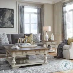 Combine traditional living and todays modern lifestyle effortlessly with the Morgan Creek. Crafted of poplar solids with pine and birch veneers finished in antique white with spatter and watermark accents with a wire brushed tobacco planked top. Features pewter nail head corner accents, round turned legs flowing into a block with tulip feet, three cubbies for additional storage and stool offer padded upholstered seat with swivel base for added comfort. The warm antique finishes and artistic distressing along with grand scale, makes this collection can be passed on for generations.