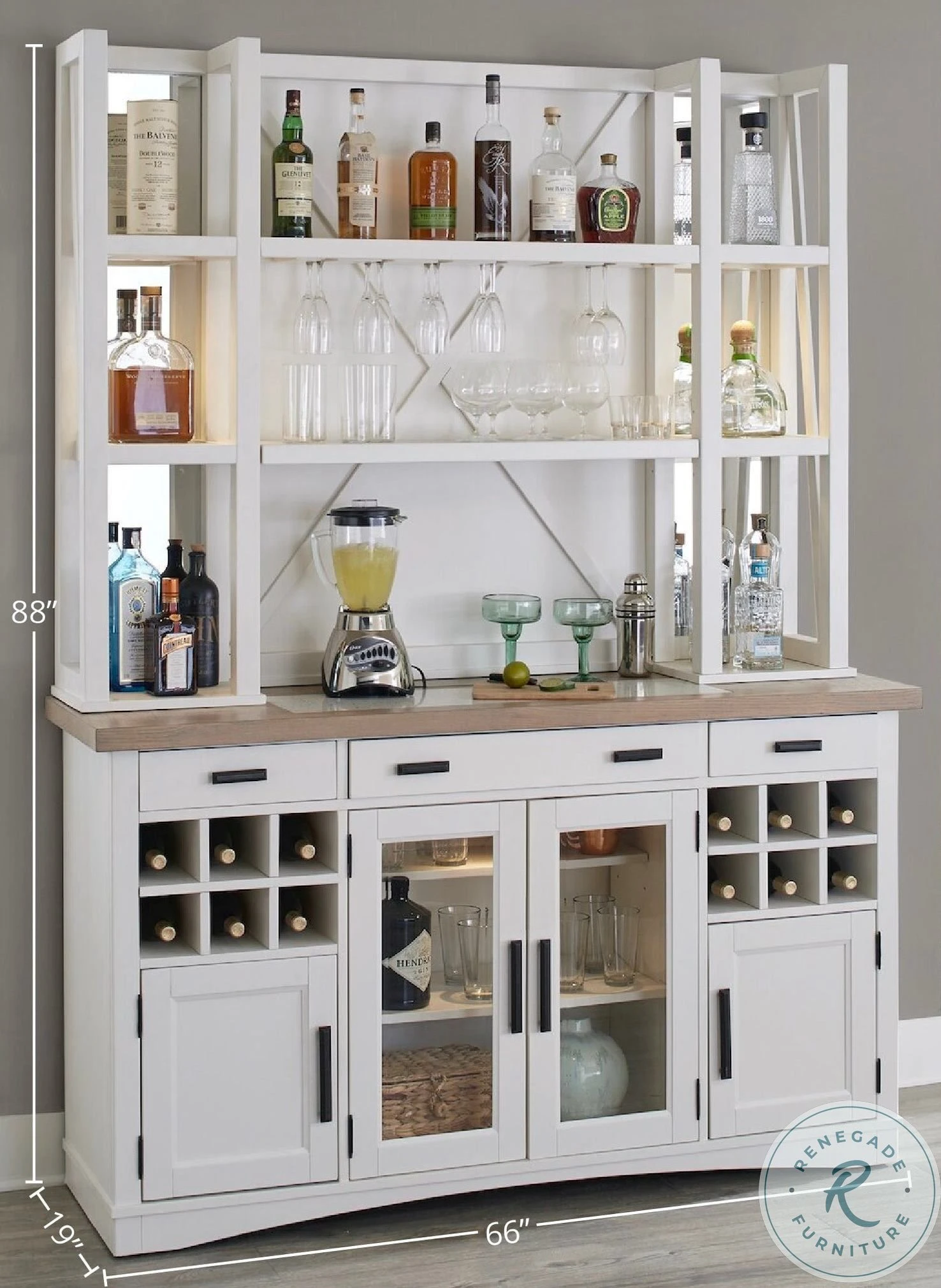 - Hanging stemware storage elegantly displays glassware