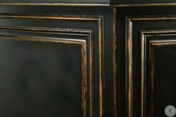 Northport Collection from Howard Miller is finished in Burnished Black on select hardwoods and veneers, and features a worn look. Includes a black faux leather armrest, accentuated with antique brass nailheads.