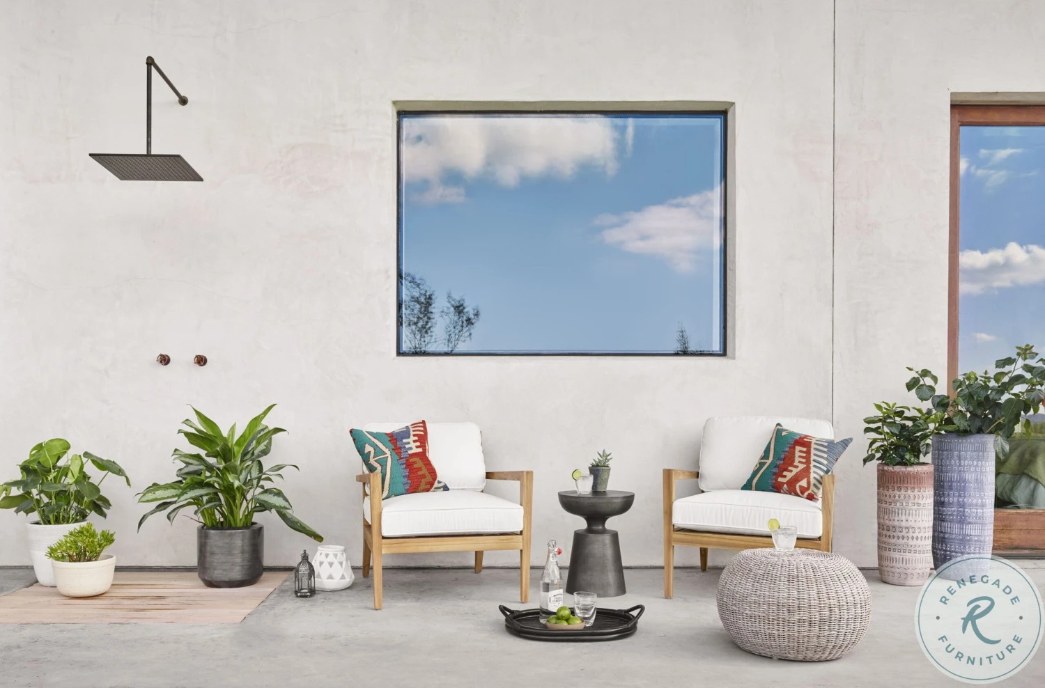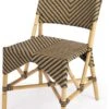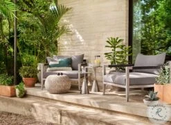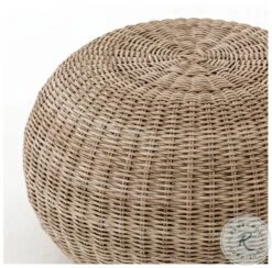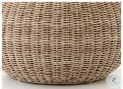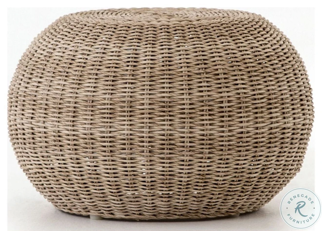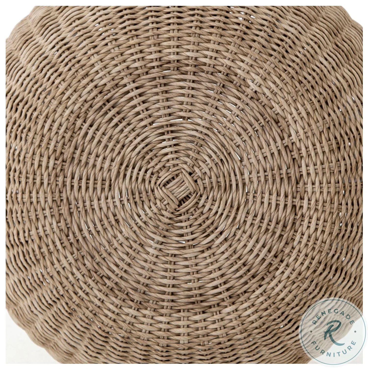 Natural in texture and tone. All-weather wicker weaves to cover an aluminum frame for a found feel with striking novelty. Soft round shape and vintage white finish lend a casual look with versatile appeal. Perfectly sized to bring an organic accent and handy extra surface to any space—indoors or out. Cover or store indoors during inclement weather.