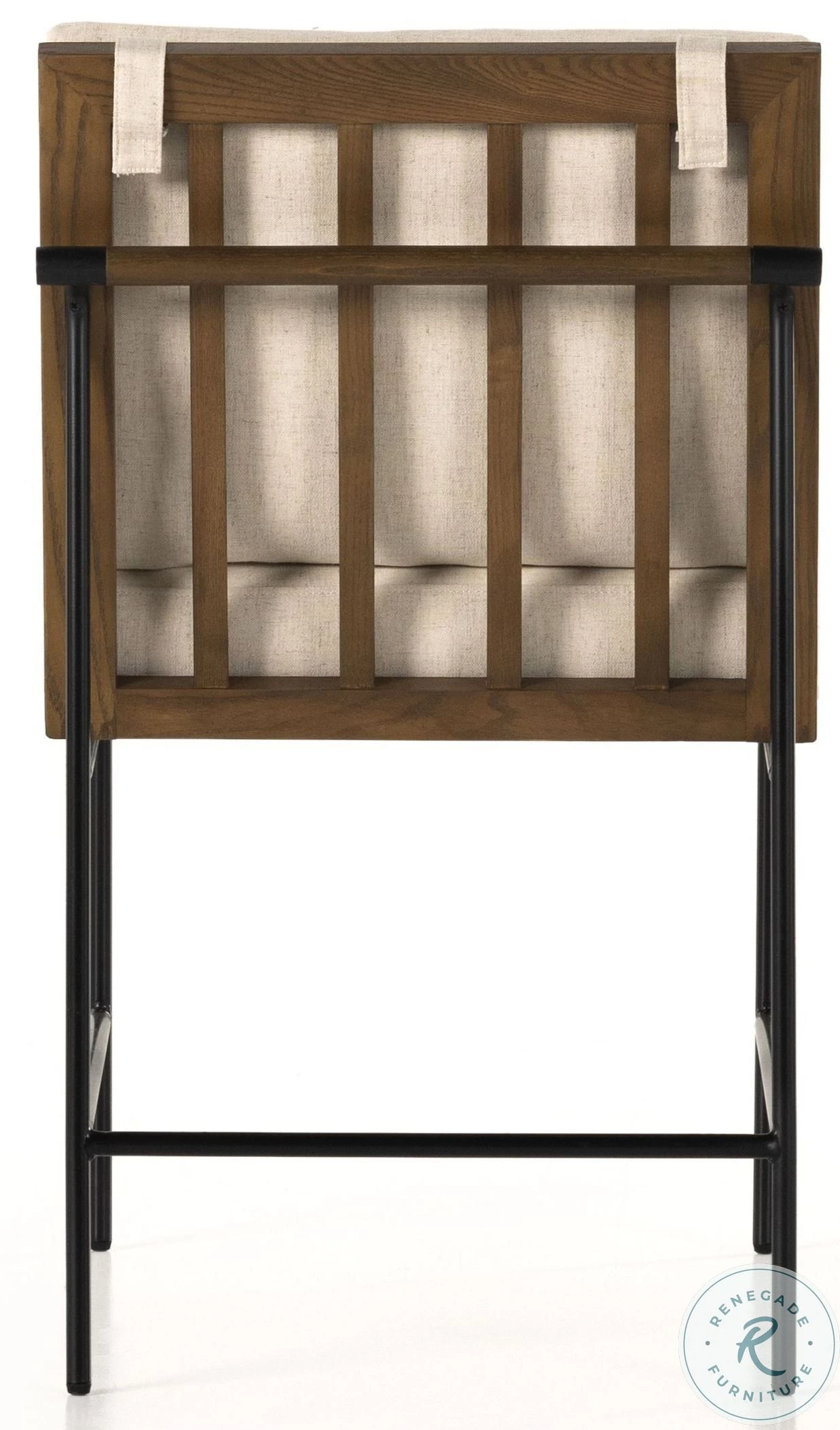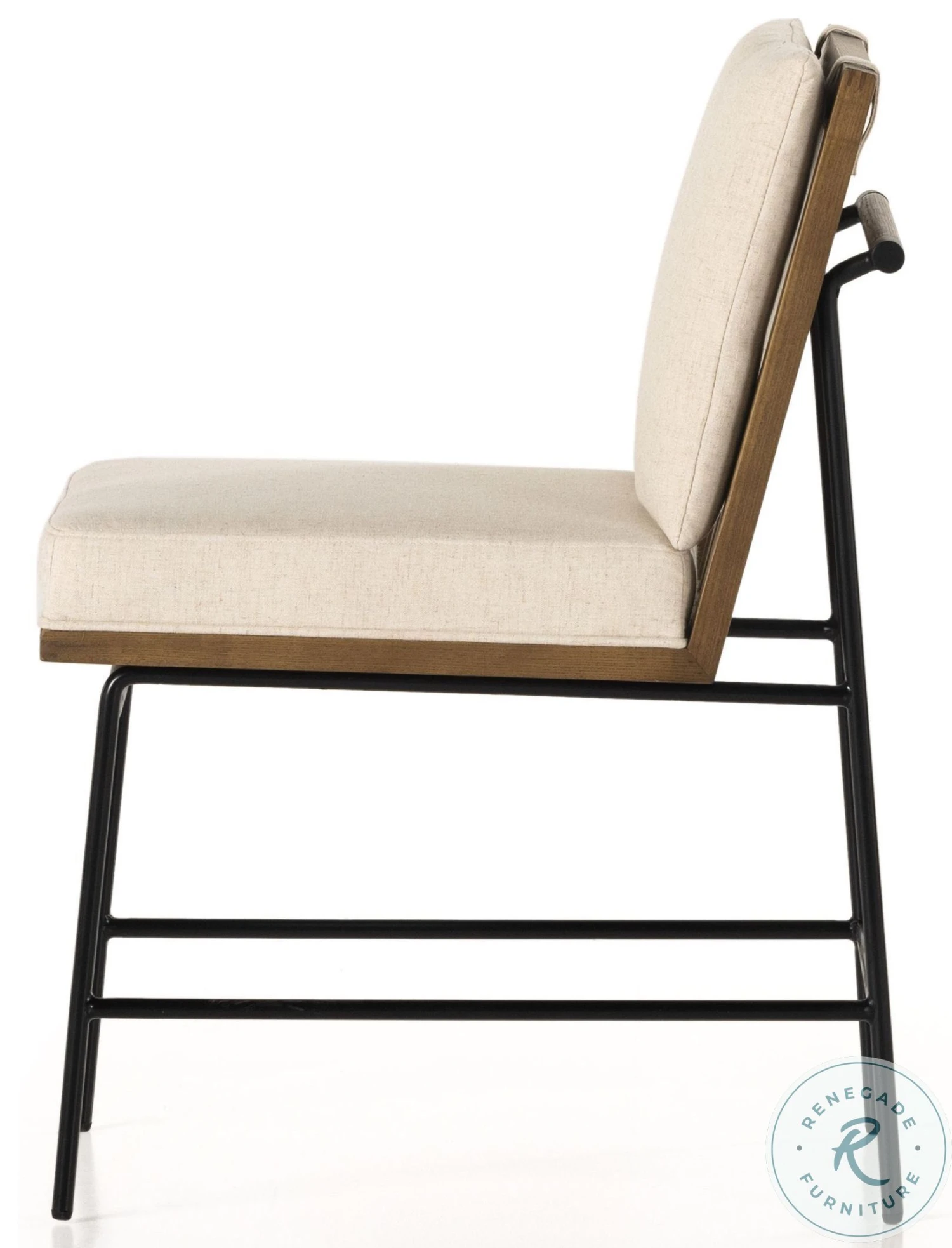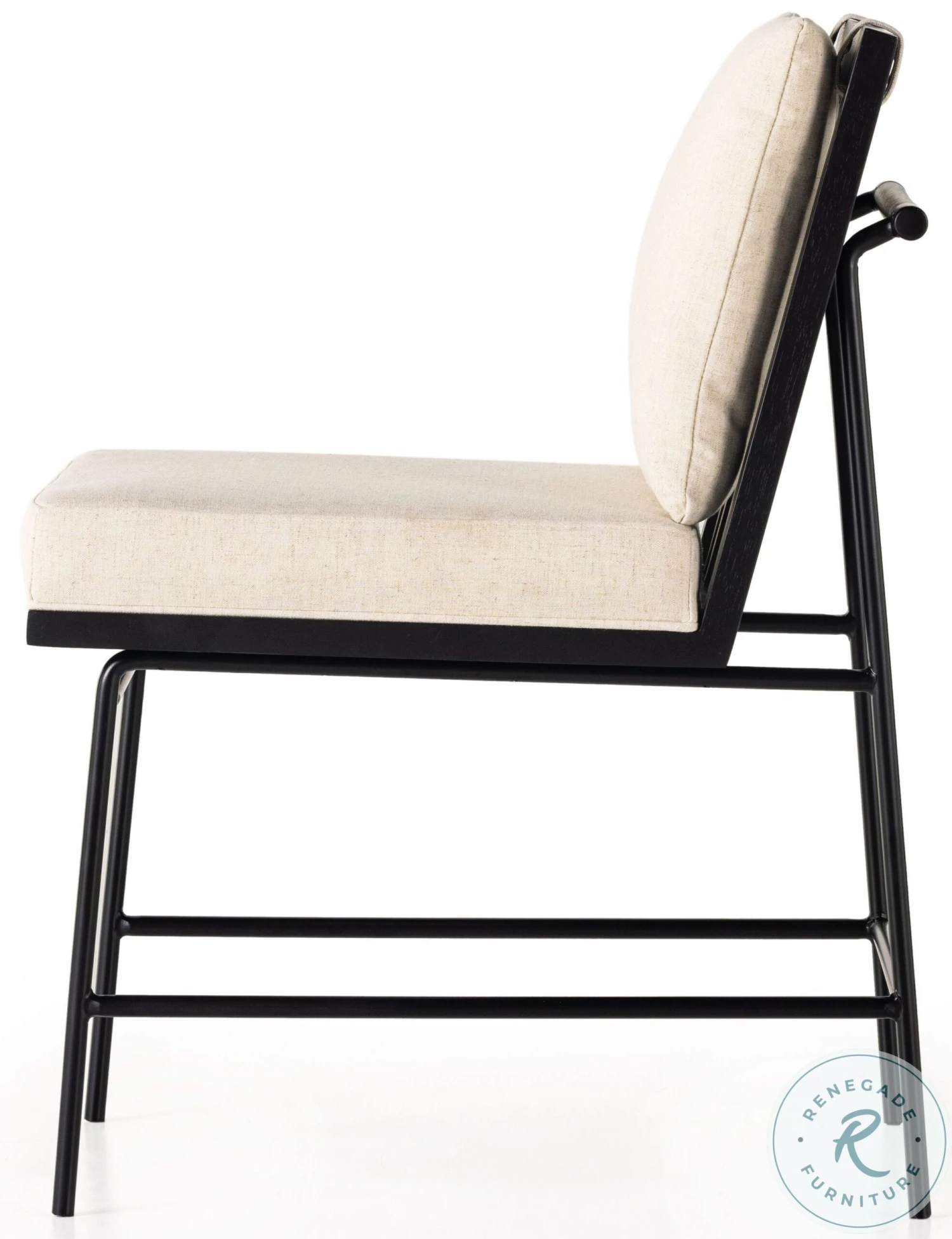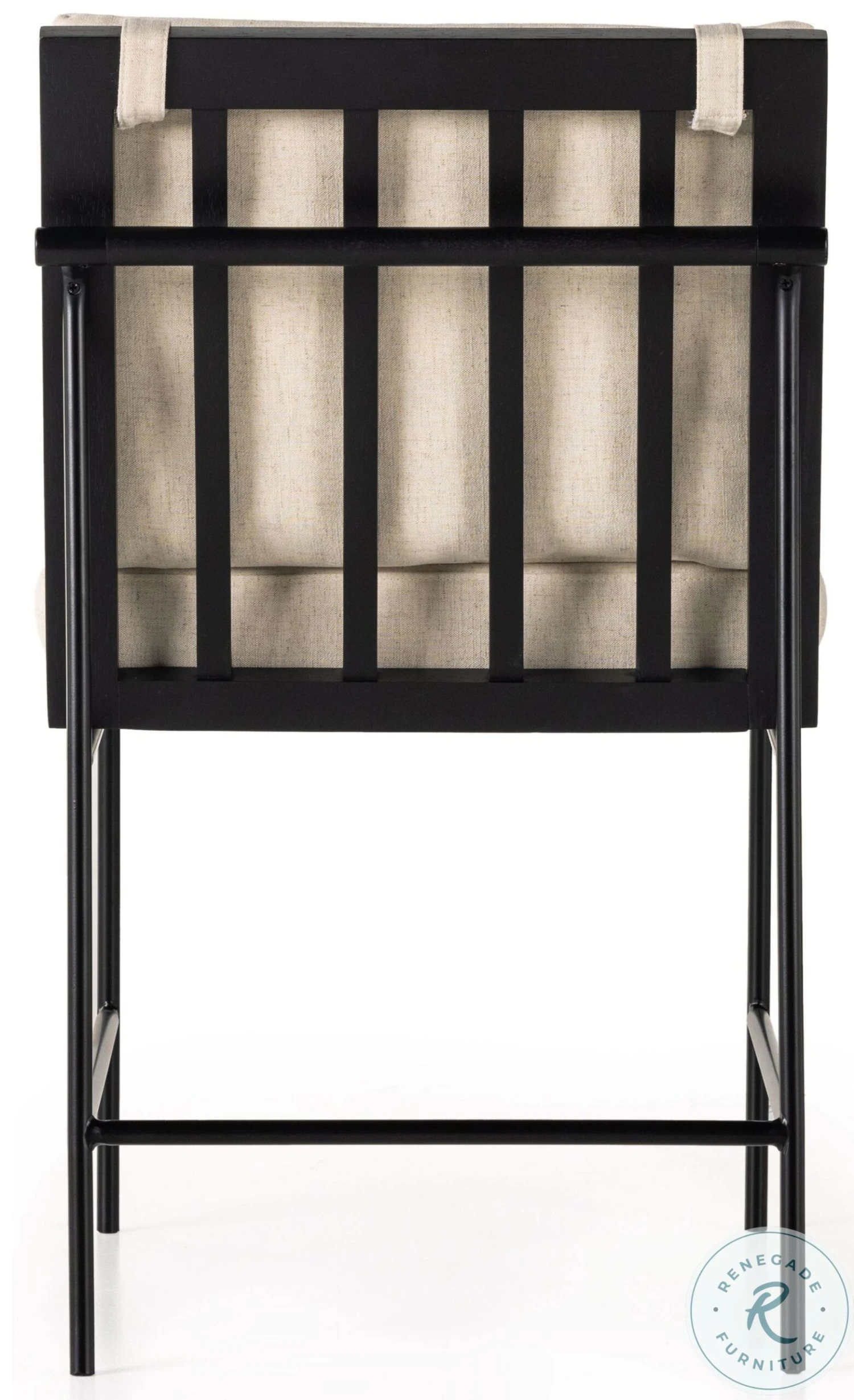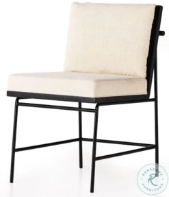 - Chair features Fabric Content 92% Polyester 8% Linen upholstered in colored high performance fabric crisp and clean design floating ladderback slim black finished iron frame and webbing seat construction
