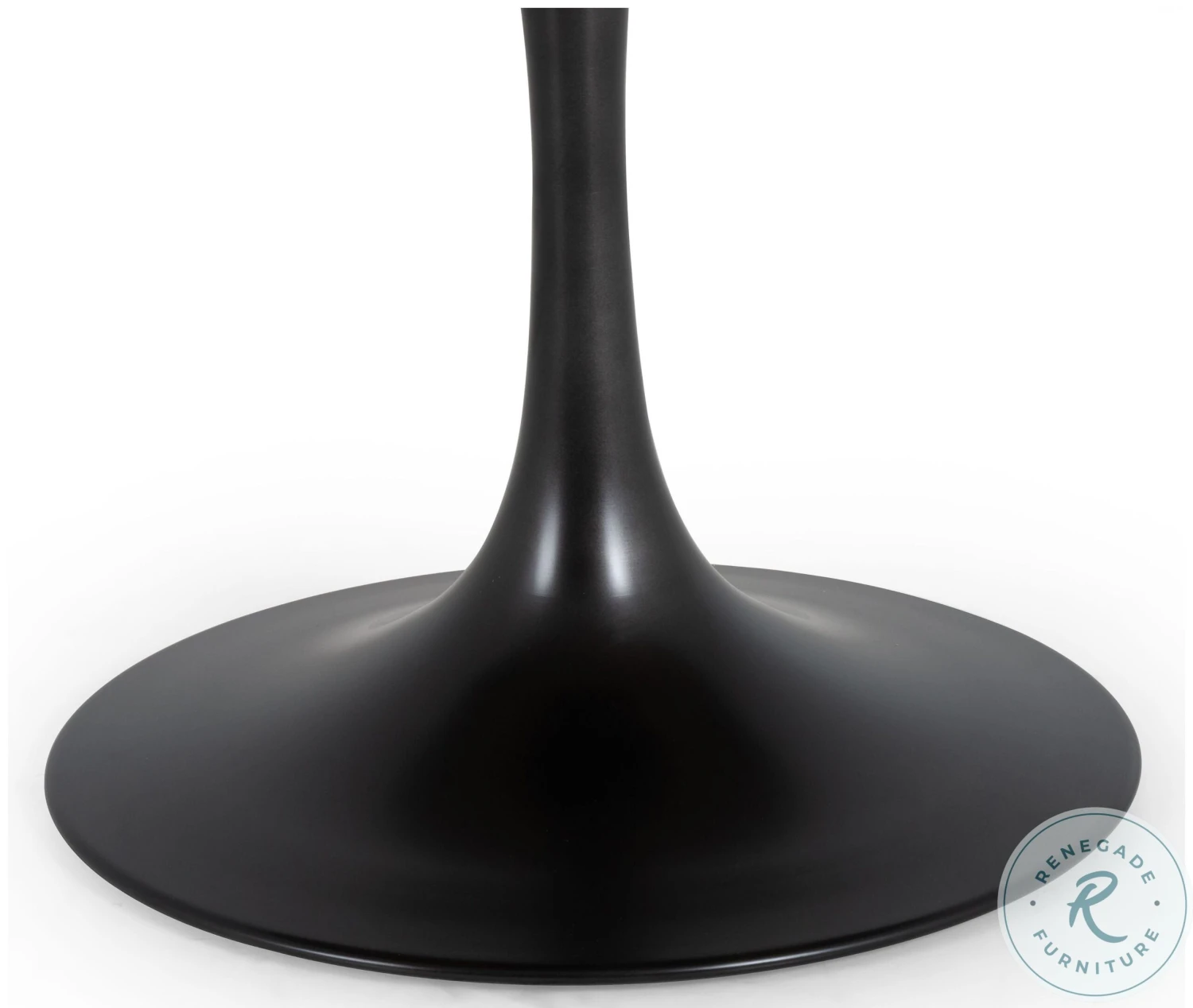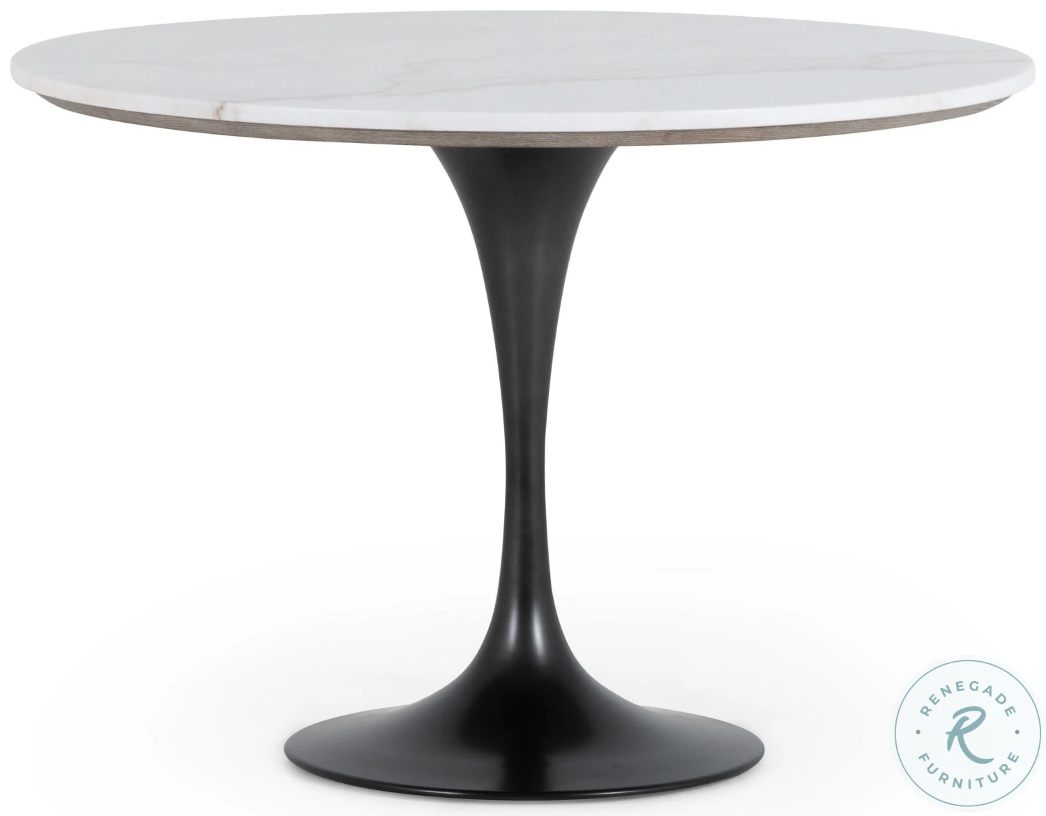 Mixed materials make the table. Classic tulip shaping is recast with a rustic black iron base and rounded top of white marble. Bistro style perfectly sized for a cozy breakfast nook.