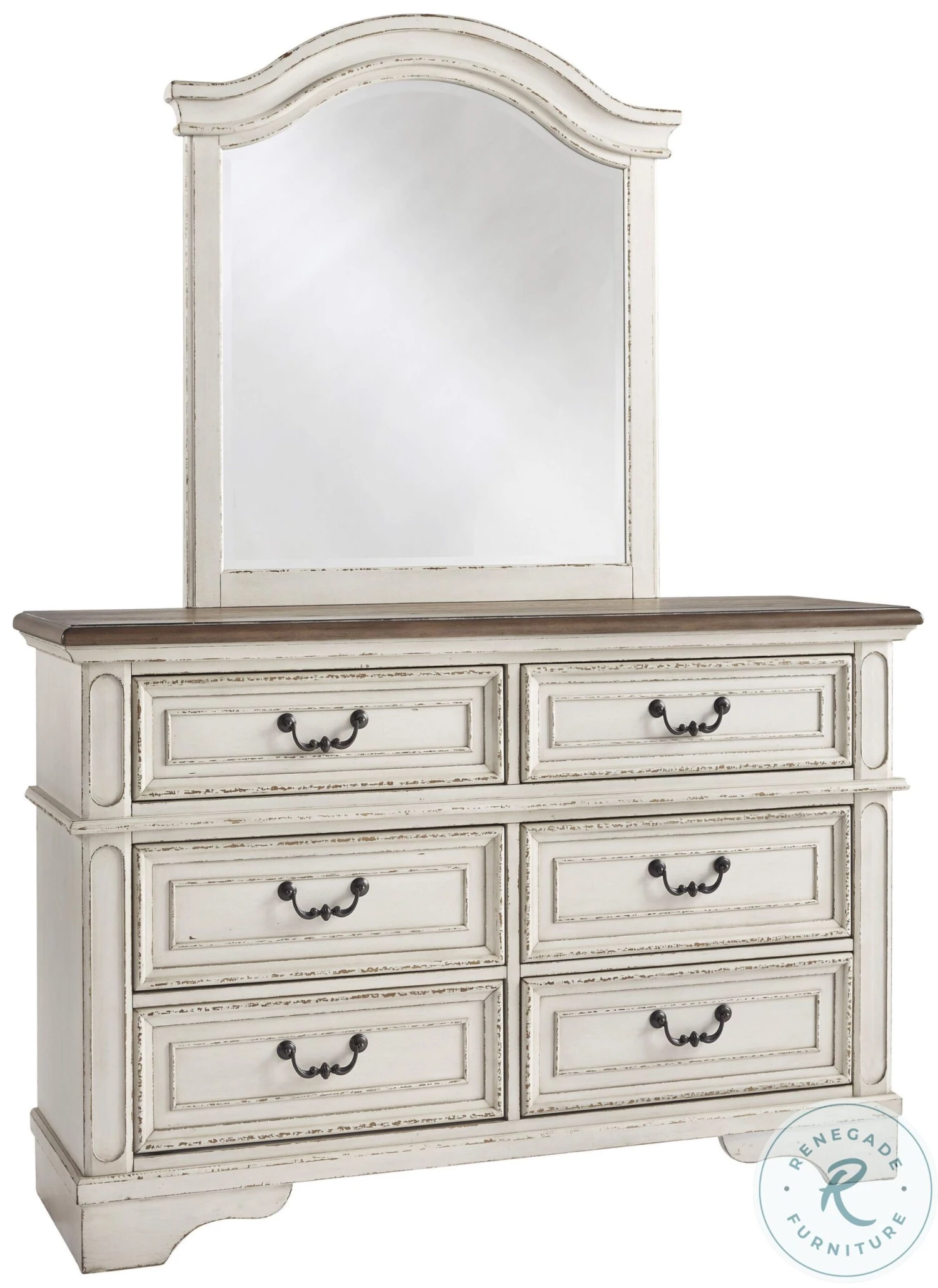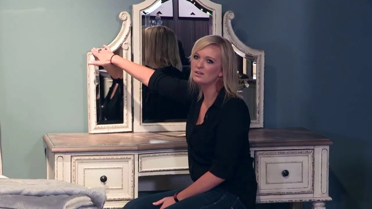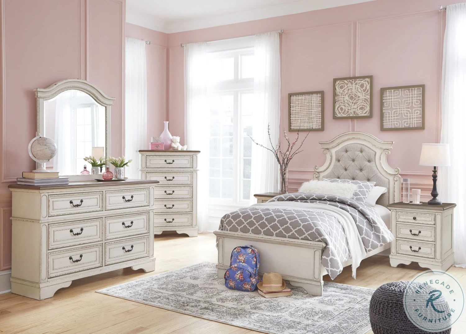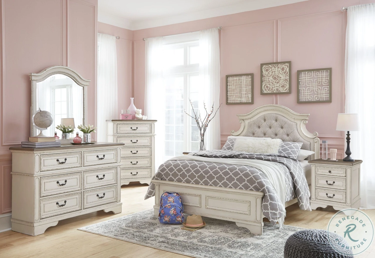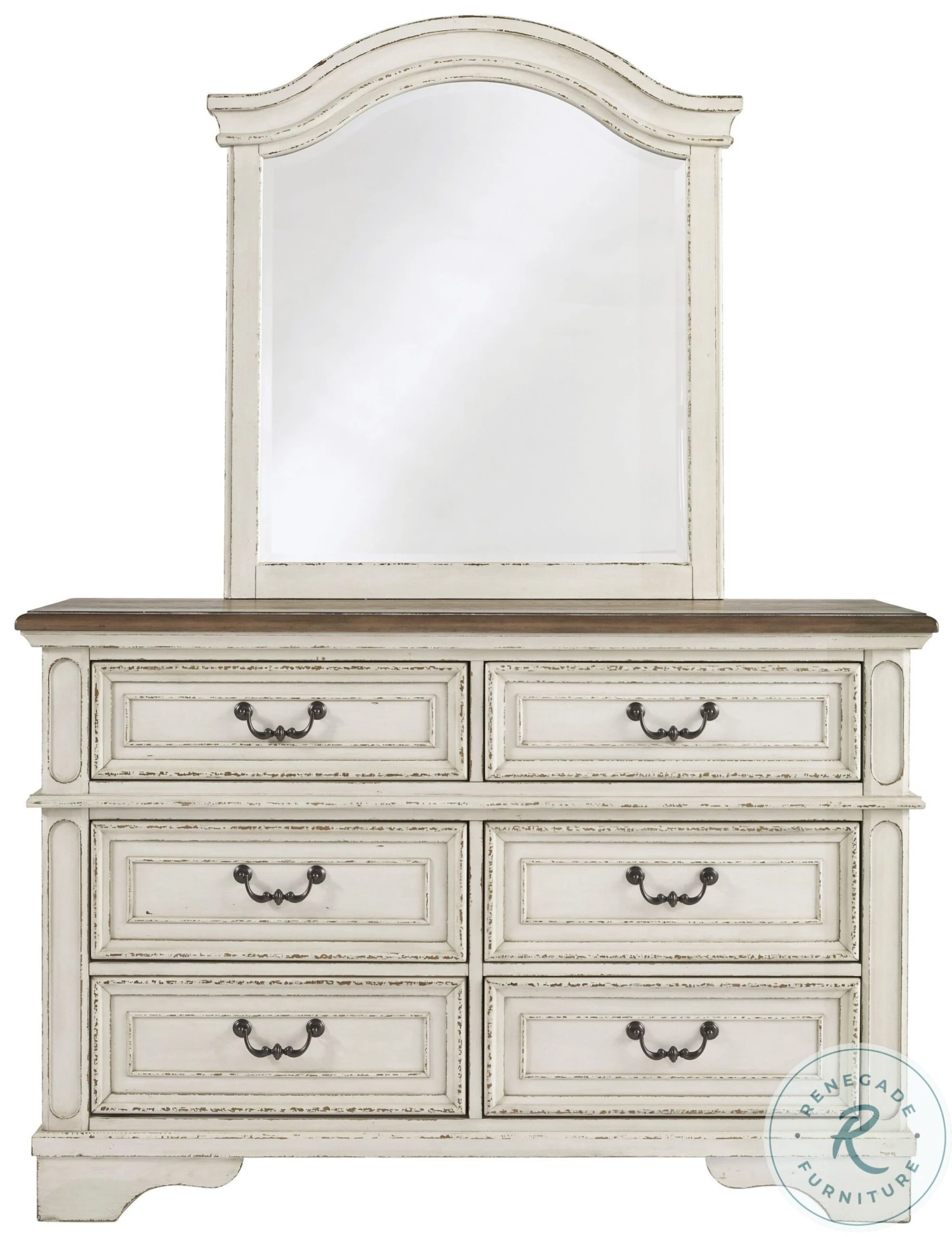 The Realyn Collection extension table has all the right ingredients for a French country-inspired feast for the eyes. Drop-in leaf allows you to transform an intimate round dining table into a gracious oval dining table that comfortably seats six. Two-tone finish pairs a highly distressed “chippy white” with a natural oak-tone top for a double serving of charm.