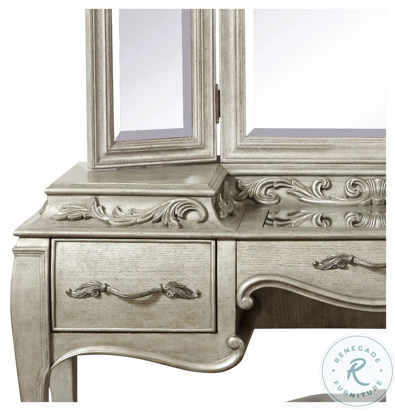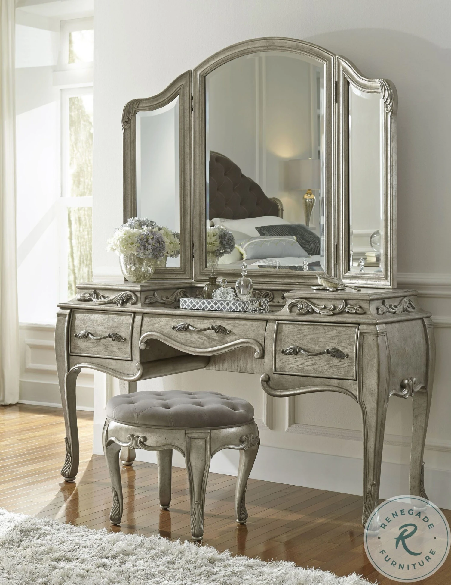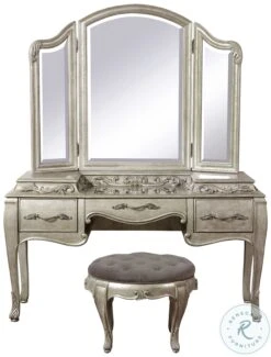 Elegant and sumptuous, the Rhianna bedroom collection by Pulaski Furniture envelops you in total luxury. The aged silver patina finish enhances sinuously curved shapes and French influenced decorative motifs. Drawers feature French & English dovetail with ball bearing full extension guides. All drawers also include a dust bottom. Come home and enjoy your well-appointed private sanctuary.
