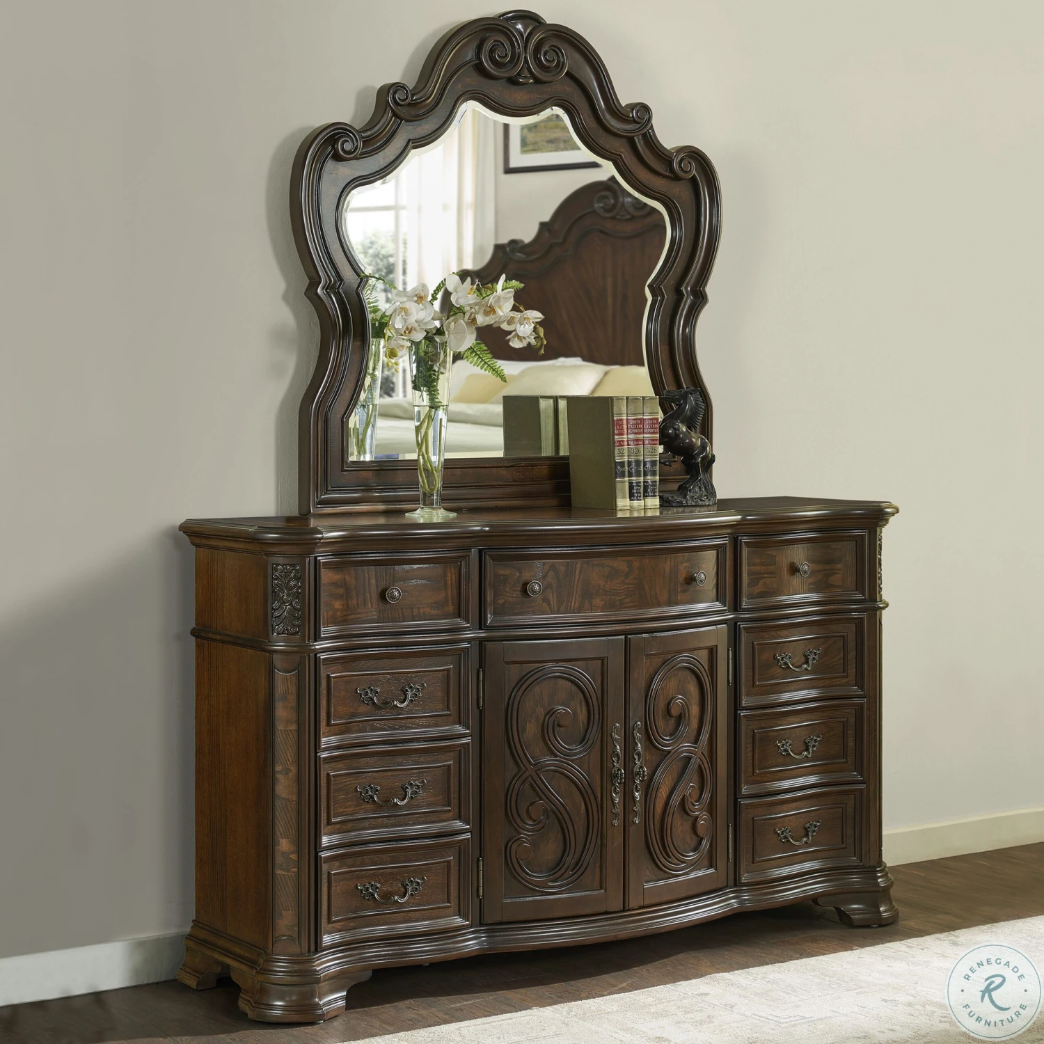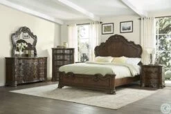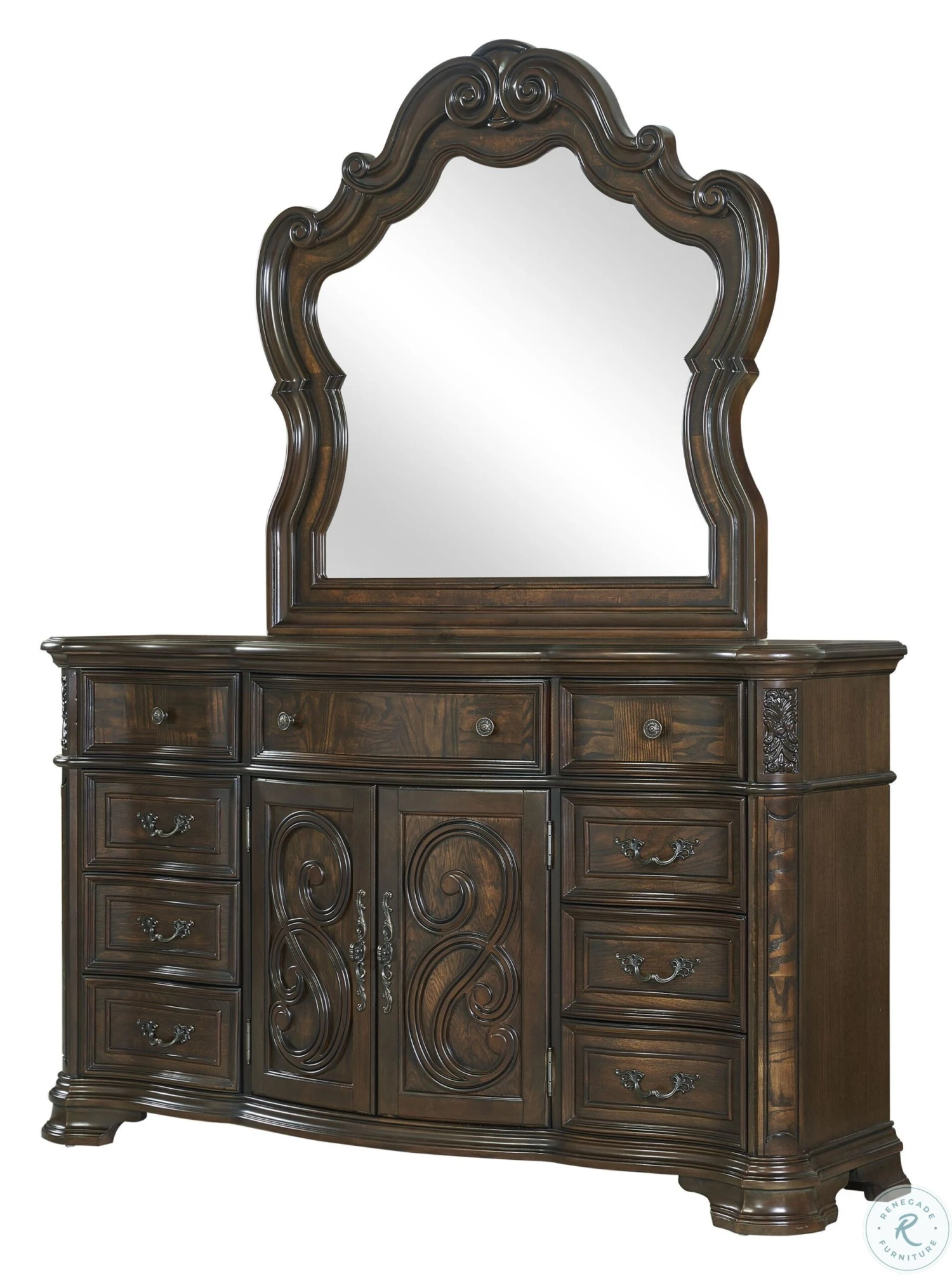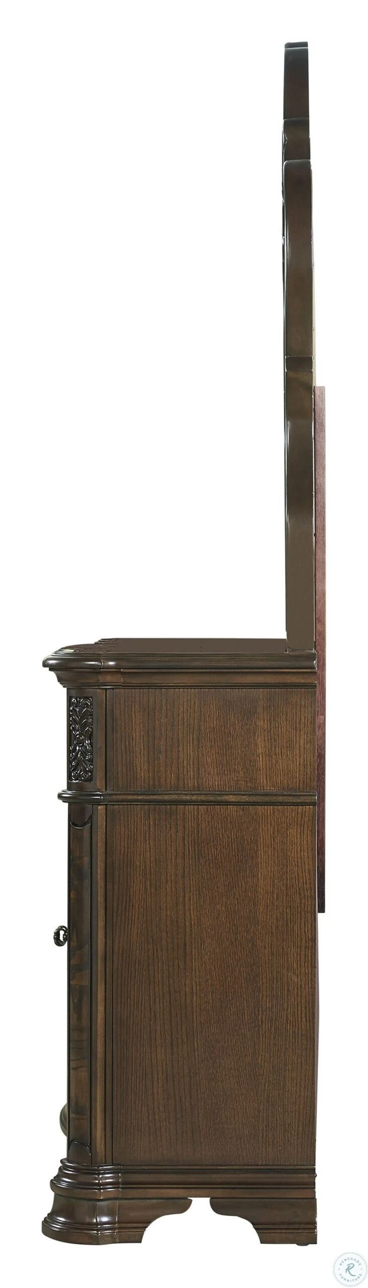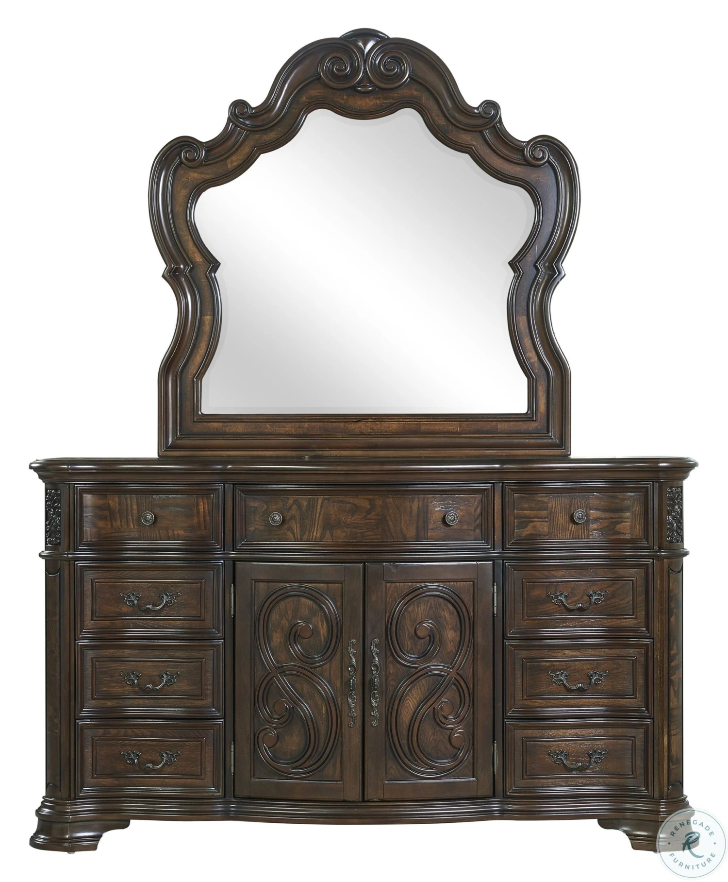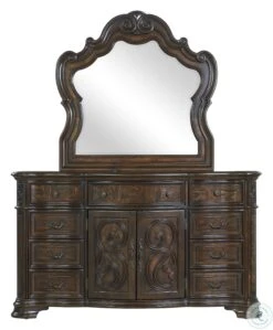 Elegant, traditional styling in a grandly scaled bedroom collection, Royale offers all the essentials of modern life in a package that honors designs from antiques past. Olive ash burl accents combine with a deep, brown cherry finish in a truly opulent presentation.Storage items include a Lift-Top Chest with valuable hidden storage, Dresser & Mirror and Nightstand with USB charging ports.