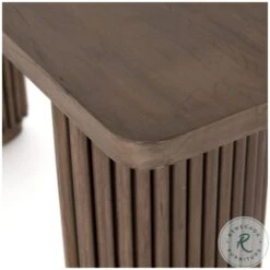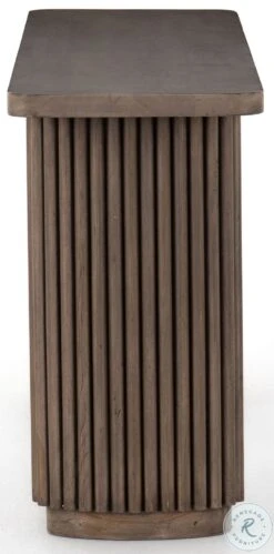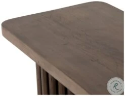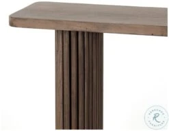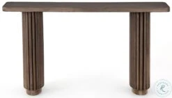 Inspired by décor in the majestic palaces of Jaipur, a conversation-starting console table is made from mixed reclaimed woods, with a rounded rectangular top and pedestal legs with vertical reading atop a sleek plinth base.