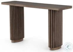 Inspired by décor in the majestic palaces of Jaipur, a conversation-starting console table is made from mixed reclaimed woods, with a rounded rectangular top and pedestal legs with vertical reading atop a sleek plinth base.