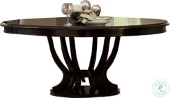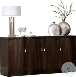 Sophisticated soft contemporary design is achieved in your dining room with the addition of the Savion Collection.Two table types are offered as versatile options to fit in your space a rectangular double pedestal table and an oval single pedestal table.Both featuring a distinct birdcage style base.An espresso finish highlights the unique veneer pattern.Dramatic flair is lent to the design by the accompanying chairs. Neutral tone fabric covers the substantially sized roll back arm and side chairs.Reeded fronts on the server along with the serpentine profile further the elegance of this distinctly sophisticated collection.