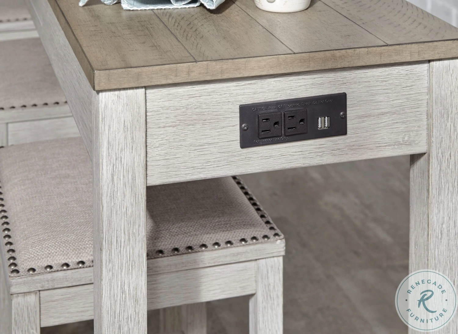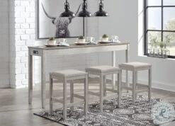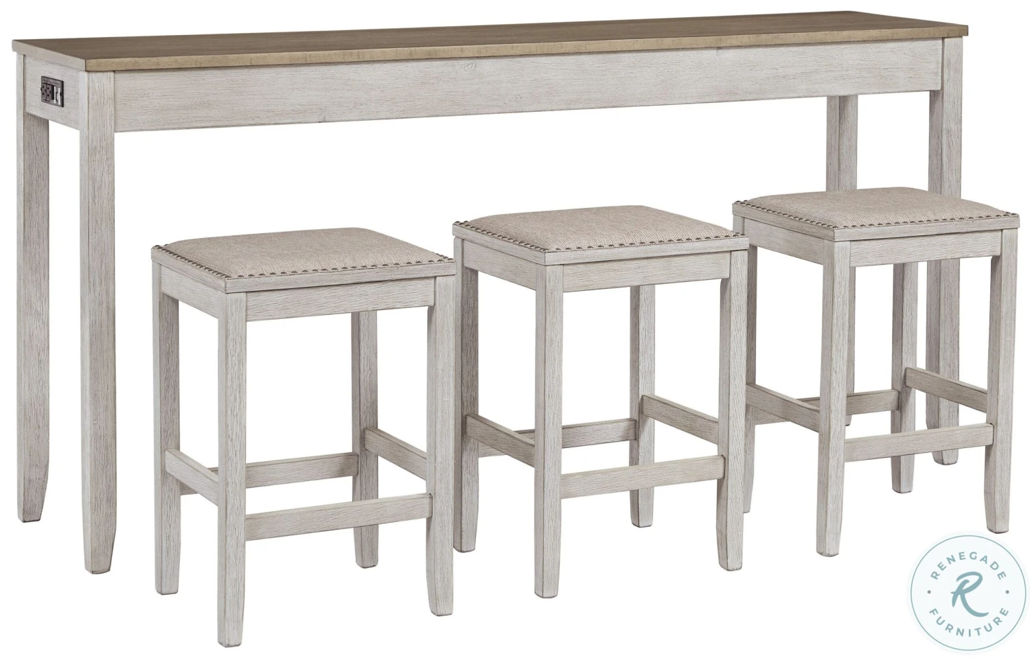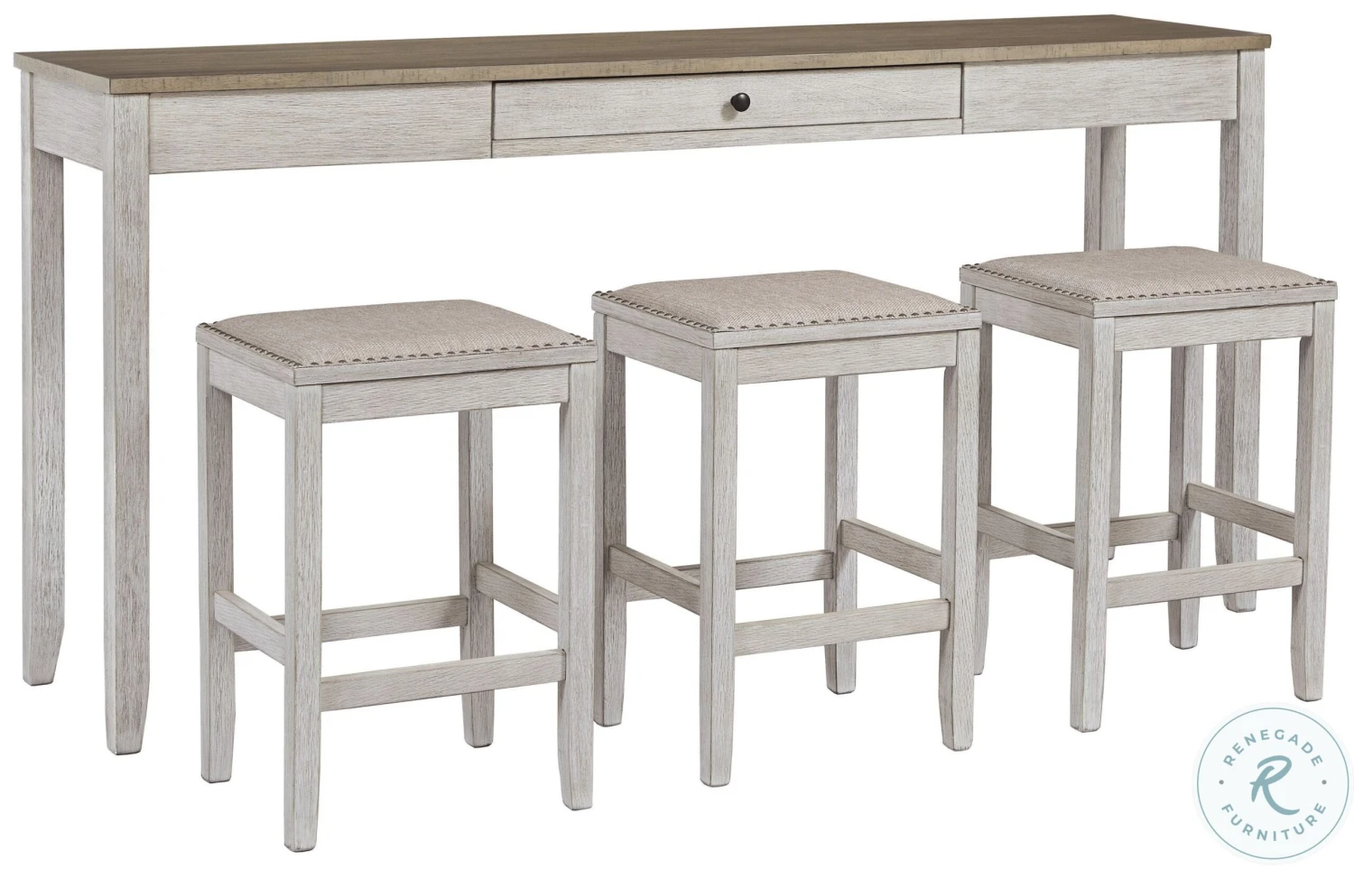 This Skempton Collection with storage invites you to raise the bar on small space living. An inspired choice for coastal chic or modern farmhouse settings, this clean-lined, simply striking Skempton Collection doubles the charm with a brown tone top with plank effect, paired with a grayish white base with rub through effect for timeworn appeal.