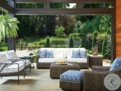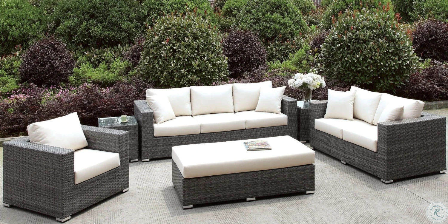 - Gray wicker and ivory cushion finish