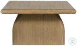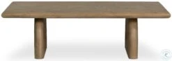 Solid mindi forms an open, minimalist-minded coffee table with large, exaggerated arches. Rectangular top with mitered detailing creates a spacious surface.
