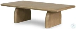 Solid mindi forms an open, minimalist-minded coffee table with large, exaggerated arches. Rectangular top with mitered detailing creates a spacious surface.