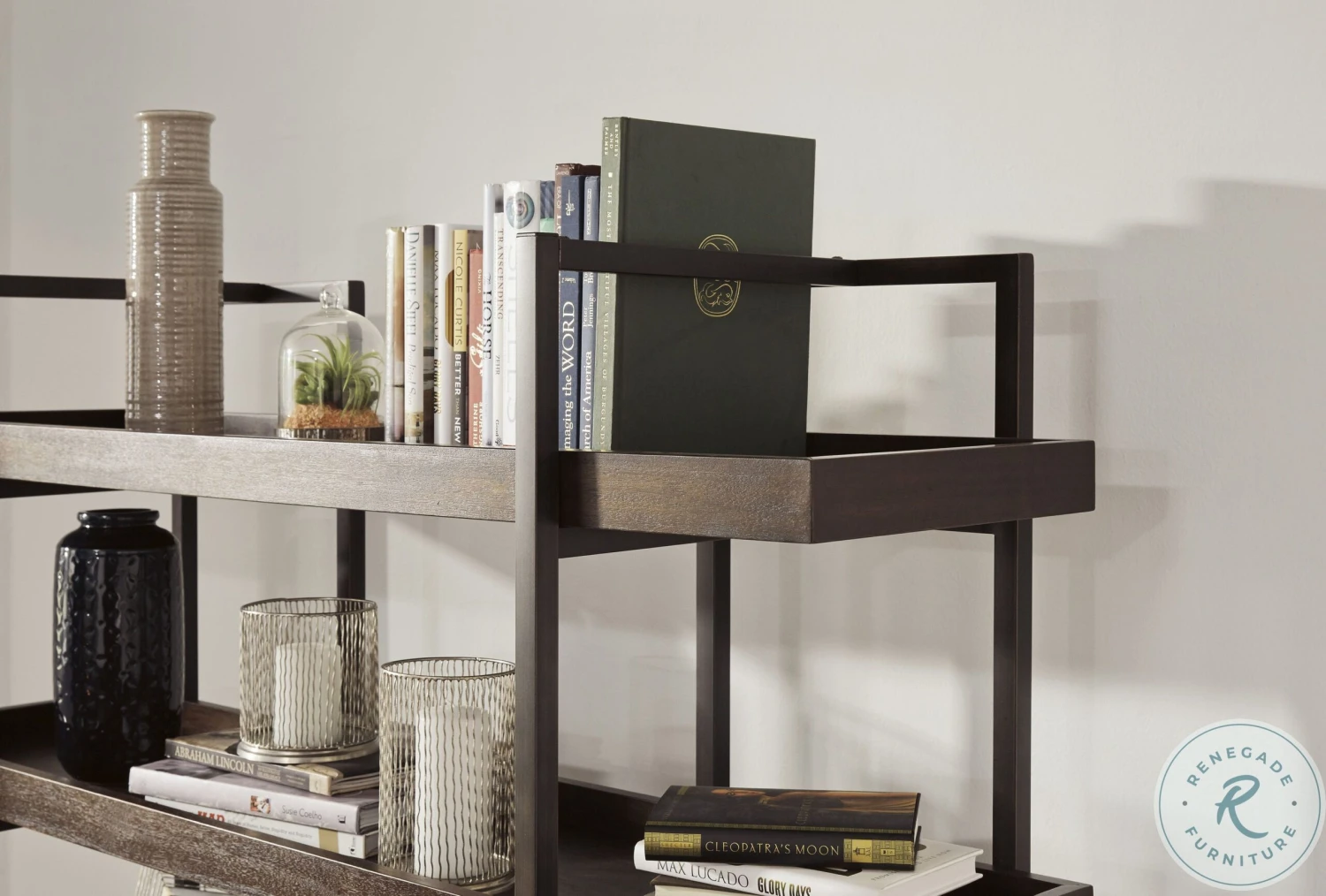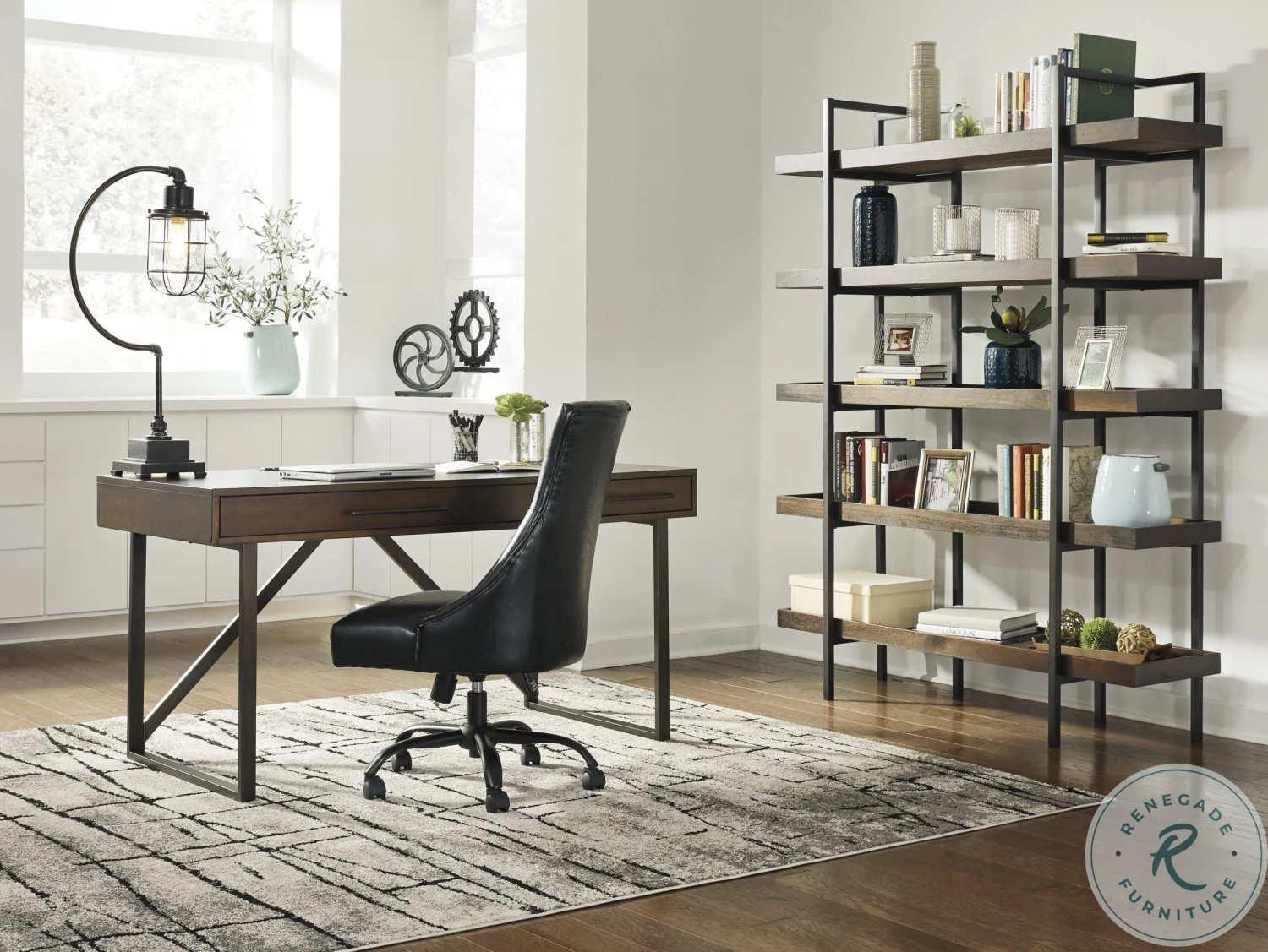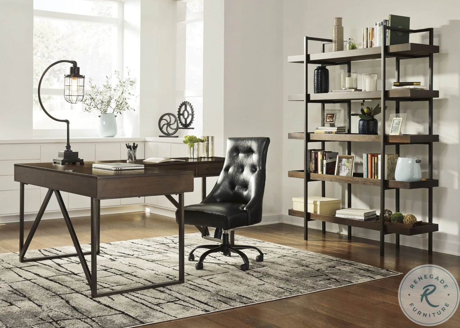 For fans of urban industrial design, this Starmore Collection steals the show. Table top is crafted with a mix of acacia veneer and wood beautified with an oiled walnut-tone finish. Sleek tubular metal frame and linear, large scale pulls pull it all together. Cutout shelf on desk’s front side incorporates added dimension.