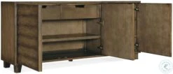 - Buffet features english dovetail drawer construction, full extension wood Undermount drawer glides, solid wood edge top, 3 doors with touch latches and soft close hinges, two self closing drawers behind left pair of doors, left drawer with removable drop in felt liner, right drawer with removable felt silverware tray, one adjustable shelf behind left pair of doors, two adjustable shelves behind right door