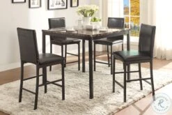 With a scale appropriate for any number of smaller dining spaces, the Tempe Collection will provide the look and style you want in your home. The transitional feel of the group comes from the richly hued faux marble table top and the minimalistic design of the dark brown bi-cast vinyl chairs. The table and chair are constructed of metal in black finish. The collection is available in counter or traditional dining heights.