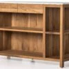 Designs are crafted from Ribbon Stripe and Quartered Mahogany veneers in an elegant dark Kona finish. Custom hardware, with exquisite detailing, is finished in bronze with a soft aged patina. Upholstered seating features hand-carved frames and dramatic fabric correlations.
