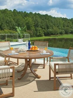 Designs in St. Tropez make a bold contemporary statement, with clean lines and a distinctive architectural perspective. Premium all weather lanyard cording emphasizes the strong horizontal and vertical motif. Dining and occasional tops feature a radial slat design in wrought aluminum with a custom finish that reads as natural teak. The look is strikingly contemporary, while the relaxed, sophisticated vide is classic Tommy Bahama.