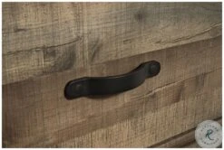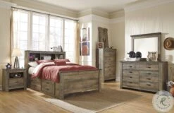 Warm rustic plank finish over replicated Oak grain and authentic touch. Tops of cases and headboard/footboard panels are captured with a nail trimmed corner piece. Rolling trundle storage box enables the option of storage or bed. Side roller glides for smooth operating drawers. Handles feature nailhead trim in a dark bronze metal finish. Slim profile dual USB charger located on the back of the nightstand tops.
