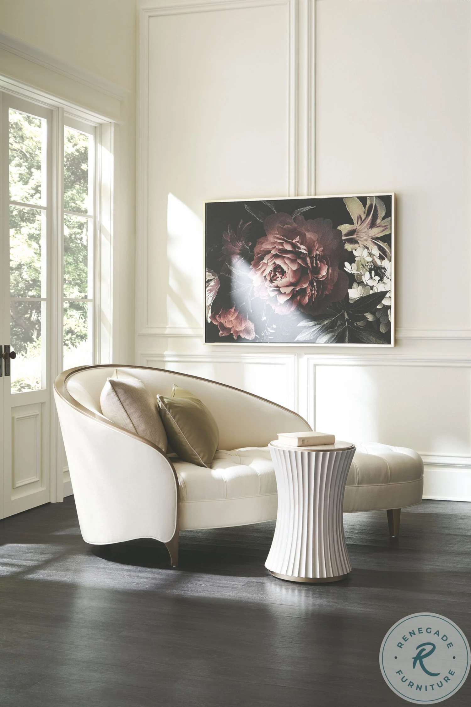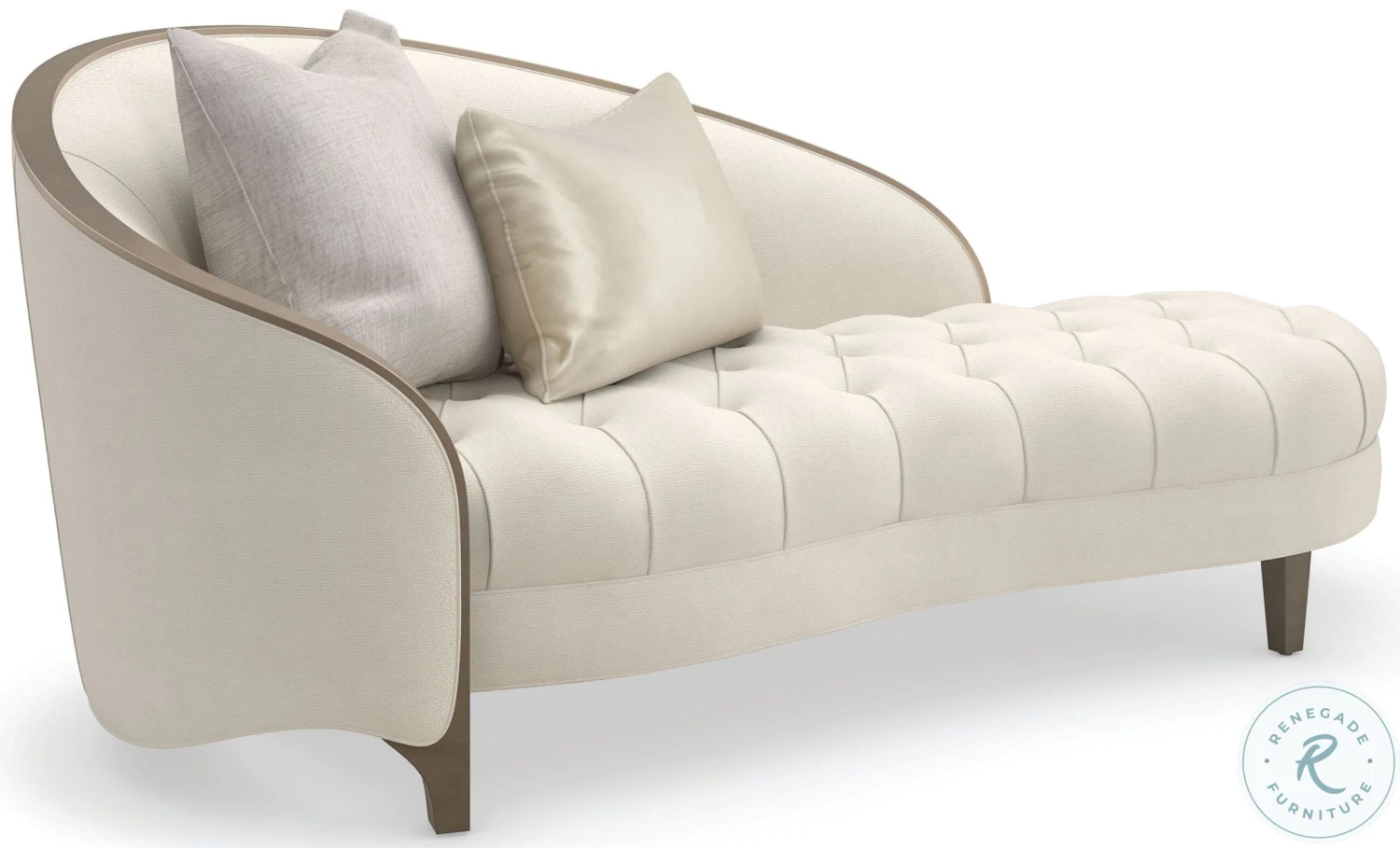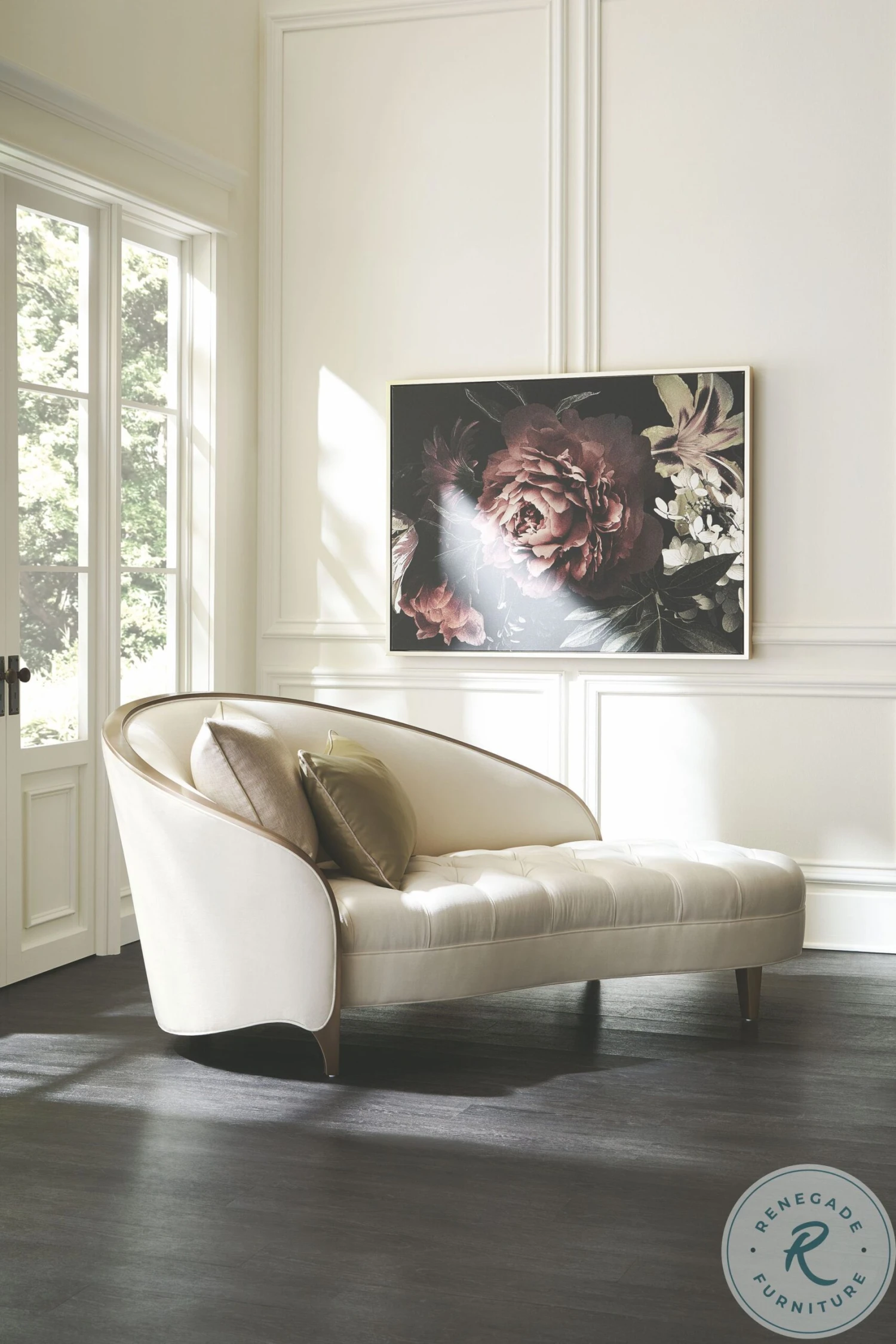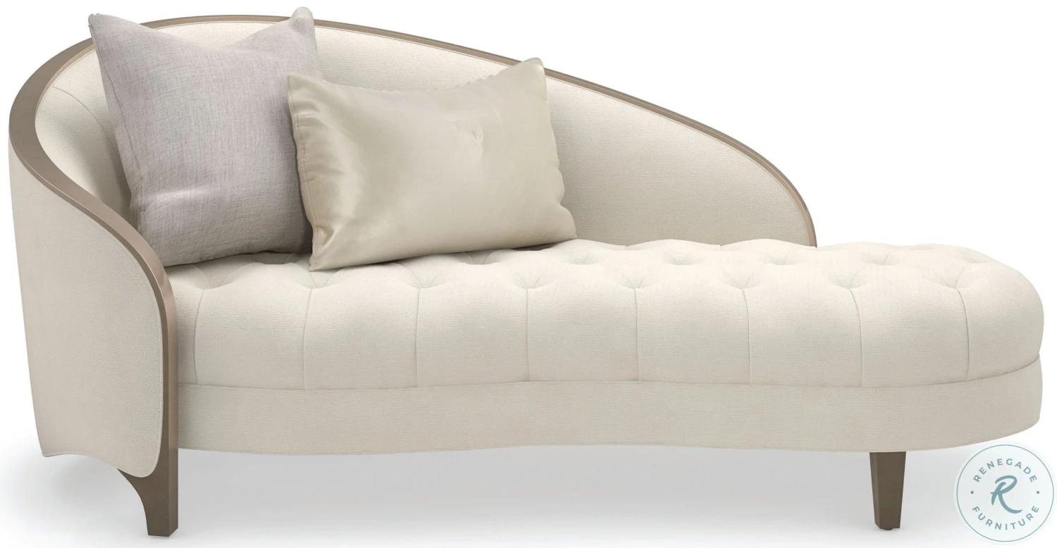 The epitome of romance, Valentina lends an elevated take on the classic chaise, with a gracefully arching back and diamond button-tufted seat dressed in a creamy velvet. An exposed wood frame in Golden Shimmer paint accentuates it’s sheltering silhouette, accented by shimmering toss pillows in a sage and silver colorway.