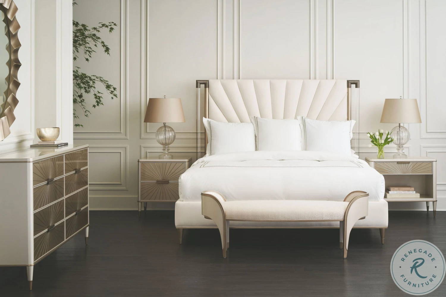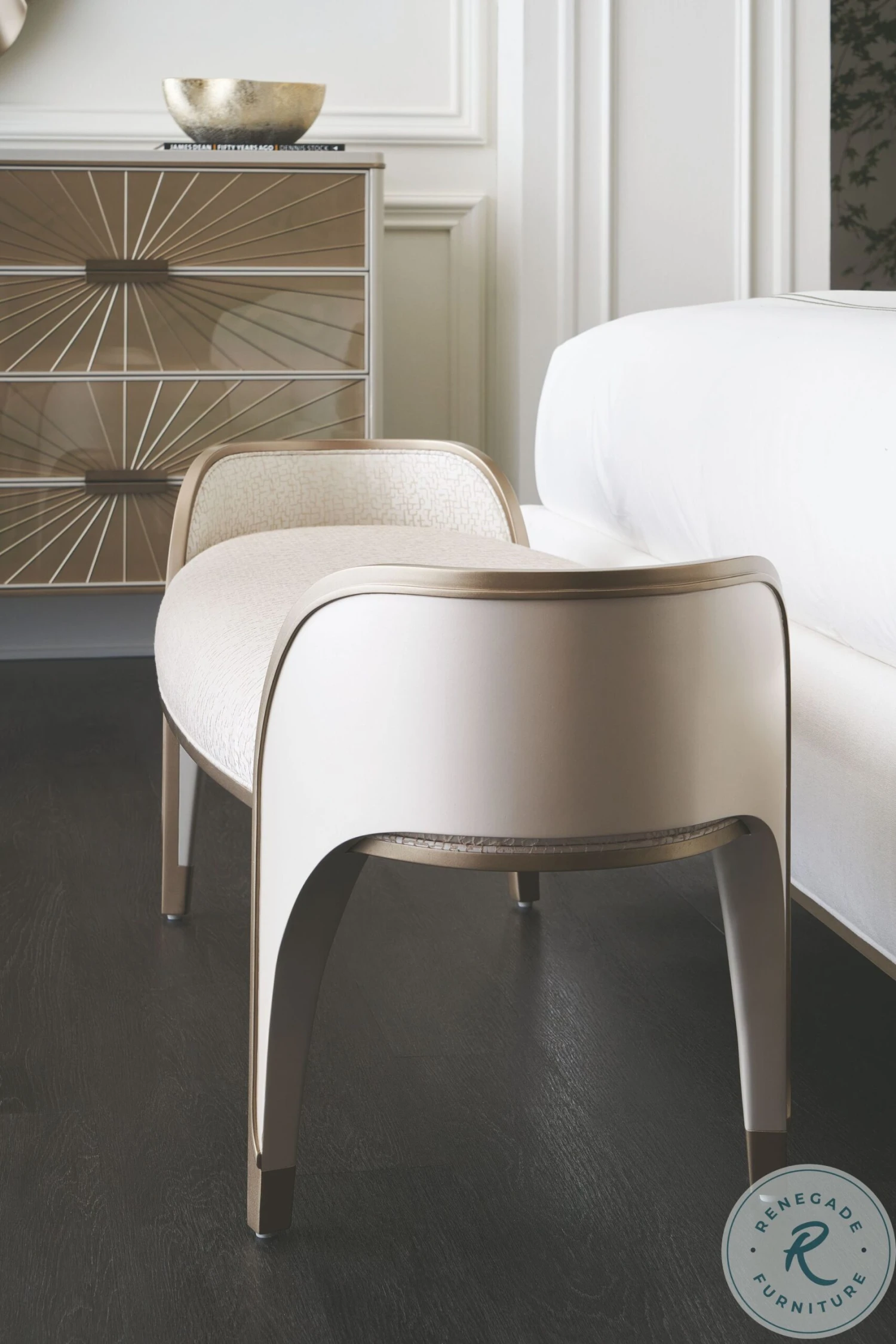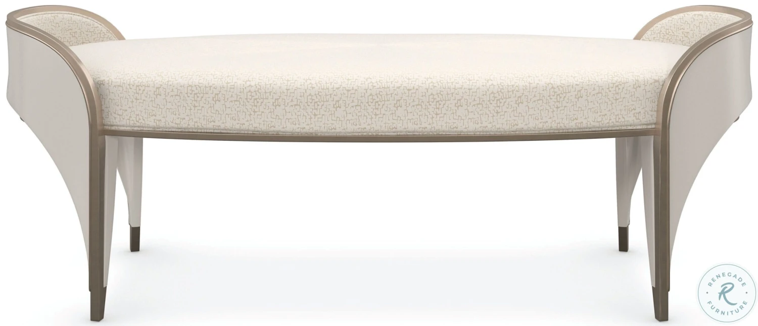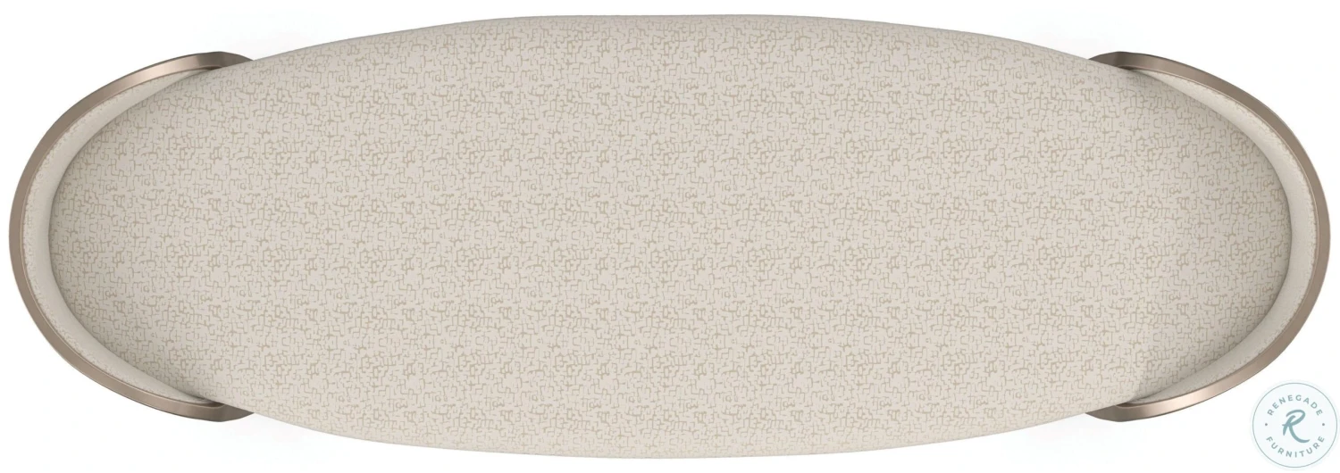 An elegant end-of-bed addition, the Valentina bench is defined by softly arching exposed wood end panels, finished in Matte Pearl and trimmed in a Golden Shimmer-painted molding. it’s oval seat beckons in a shattered ice creme and gold satin fabric that adds a subtle layer of texture. Fluid in form and function, it makes a luxurious accent in hallway nooks and dressing areas.