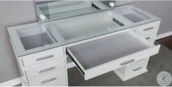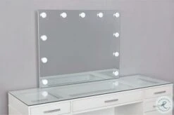 Valentina Collection from Furniture of America. A series of glitzy bulbs line the large full bleed mirrors, and a glass tabletop adds to the luxurious appeal. Top it off with a padded stools with curved, Queen Anne style legs and you have a piece fit for a Hollywood inspired setting.