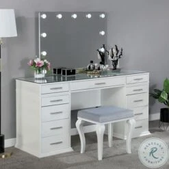 Valentina Collection from Furniture of America. A series of glitzy bulbs line the large full bleed mirrors, and a glass tabletop adds to the luxurious appeal. Top it off with a padded stools with curved, Queen Anne style legs and you have a piece fit for a Hollywood inspired setting.