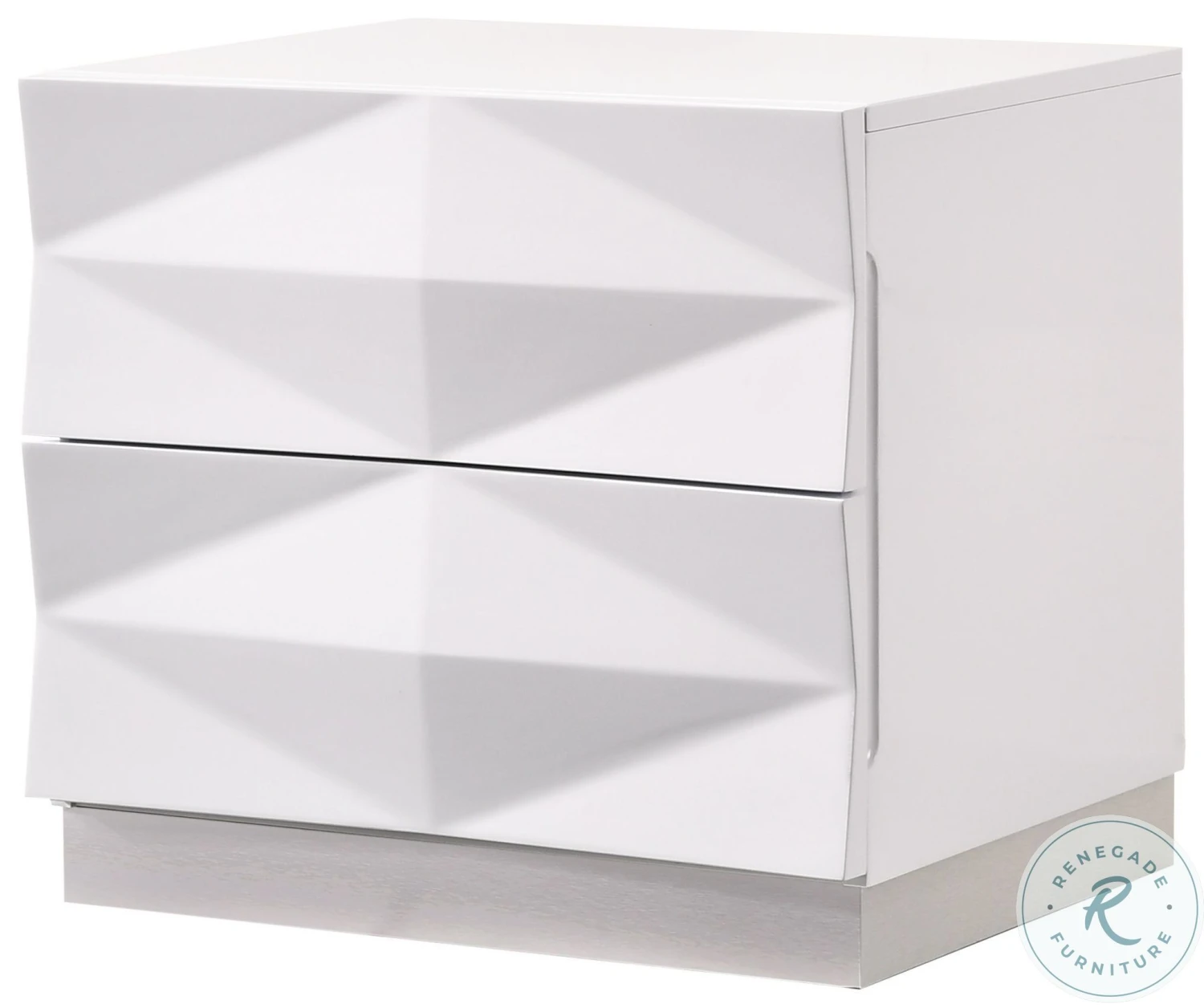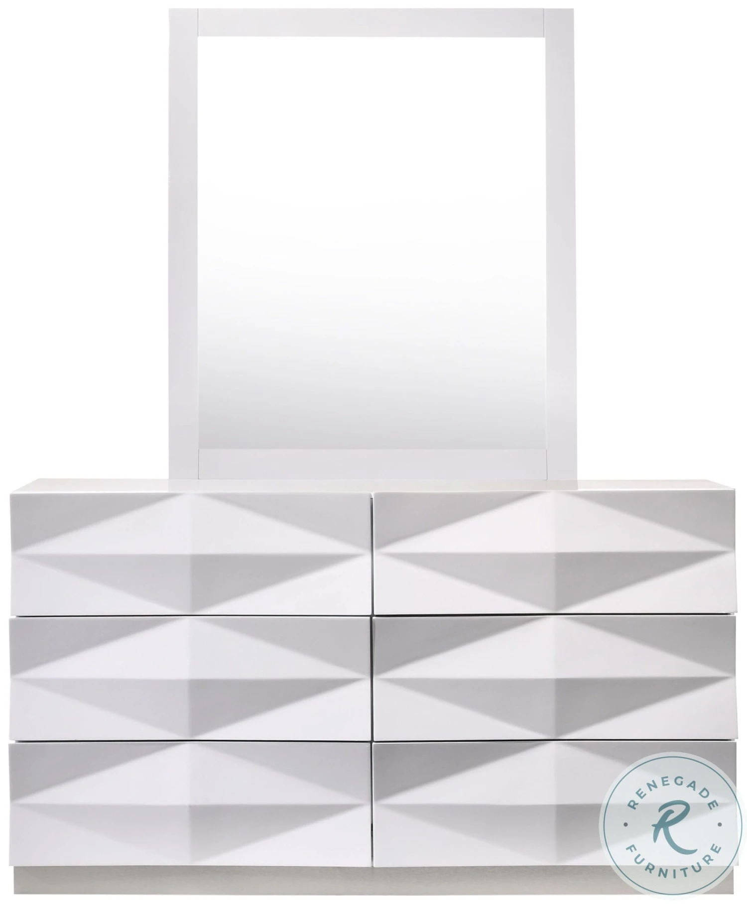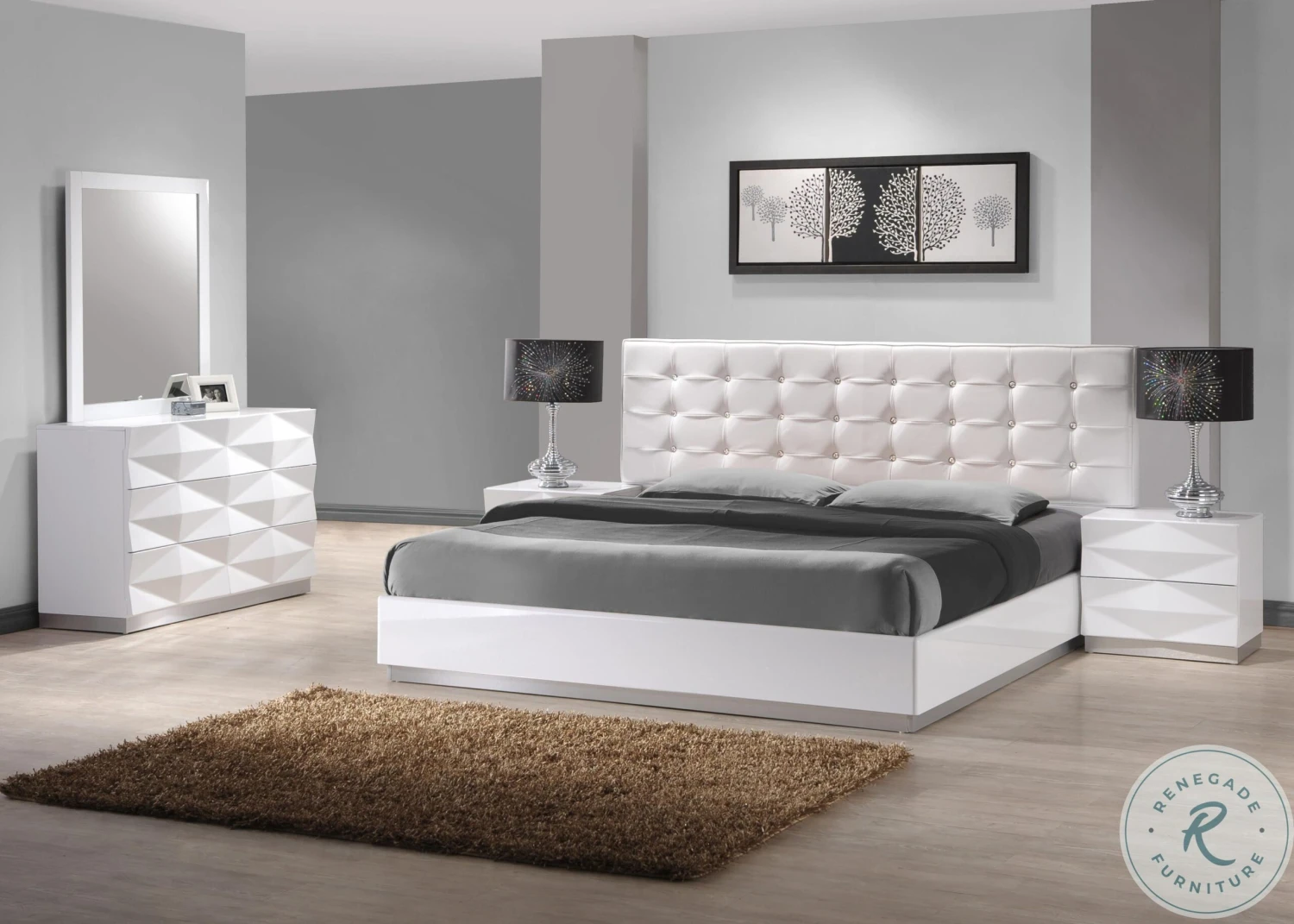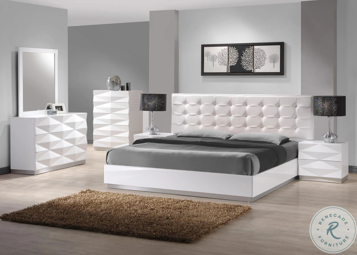 Verona Bedroom by J&M Furniture offers a fresh aim and outlook of the modern bedroom. With case goods featuring unique 3D surfaces, this white lacquered finish set will enhance the look of bedrooms of different sizes and colors. The leatherette headboard provides elegance as well as a classic look to the bedroom set. Whether choosing the entire set, its individual platform bed, or any of the case goods, you can rest assured that this quality furniture is meant to last. Our case goods are equipped with full extension glides.