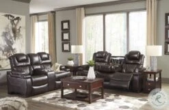 Your modern living room awaits with this Warnerton Collection. Complete with practical faux leather upholstery, one-touch power controls, adjustable headrests and USB ports, it makes finding the best seat in the house a breeze. What a perk that the center seat is crafted with a drop down table with power / USB plug-ins and dual cup holders. Armrests with storage and cup holders keep drinks, snacks and remotes close by. Go ahead treat yourself to a high design home theater experience, priced to put you at ease.