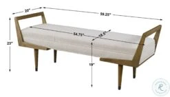 A Bench For Extra Seating With A Mid Century Twist In It’s Modern Birch Wood Frame Lightly Finished In A Smooth Oak Finish, With A Tufted Bench Seat In A Woven Ivory Fabric. Seat Height Is 19″.